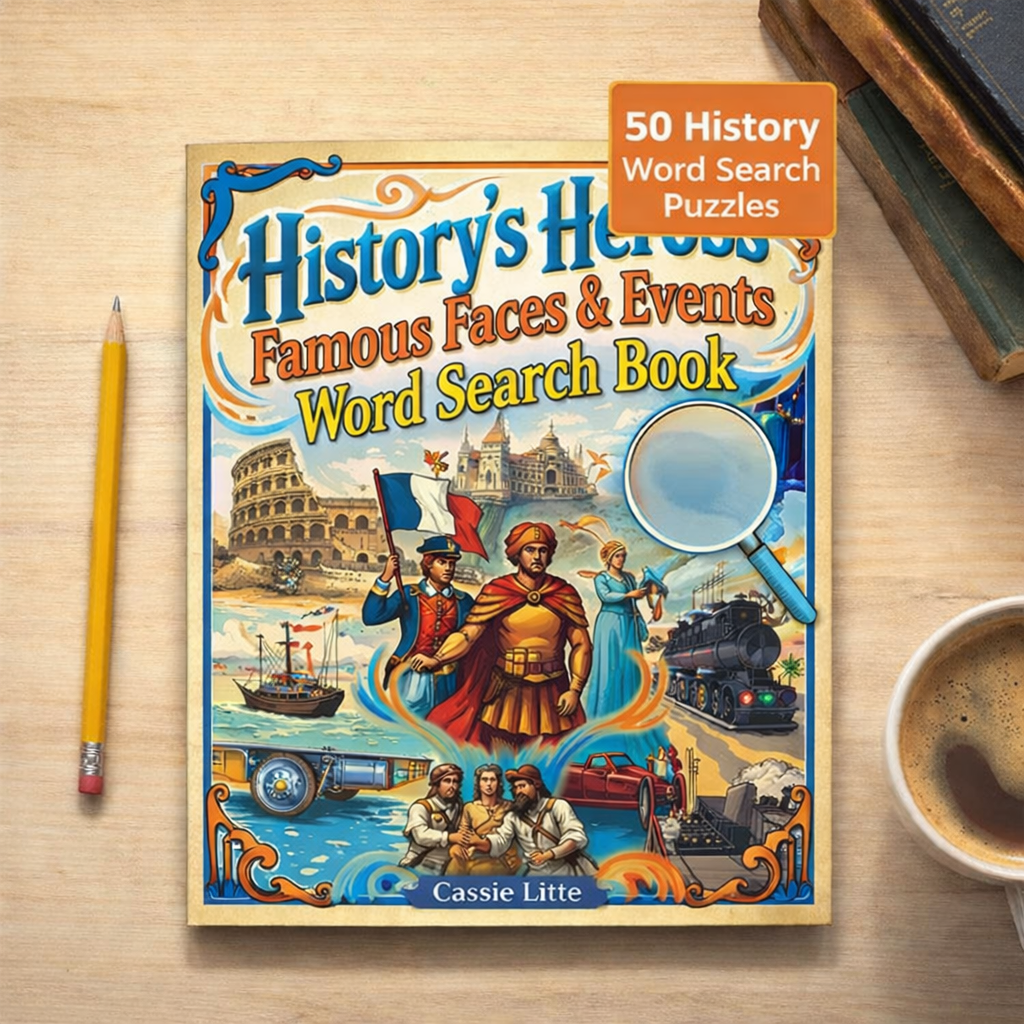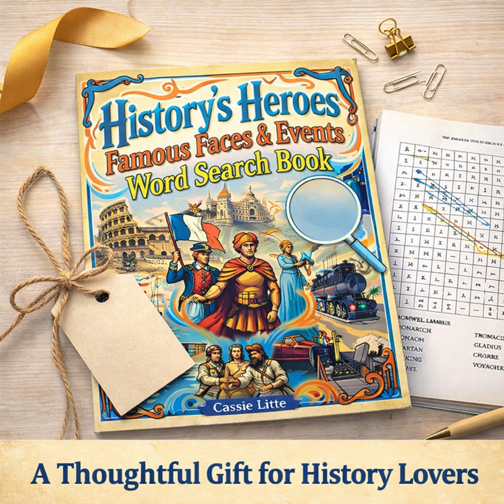 Inside, you’ll explore historical heroes, empires, revolutions, and defining moments through 50 carefully crafted word search puzzles that span ancient civilizations to more modern eras.