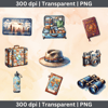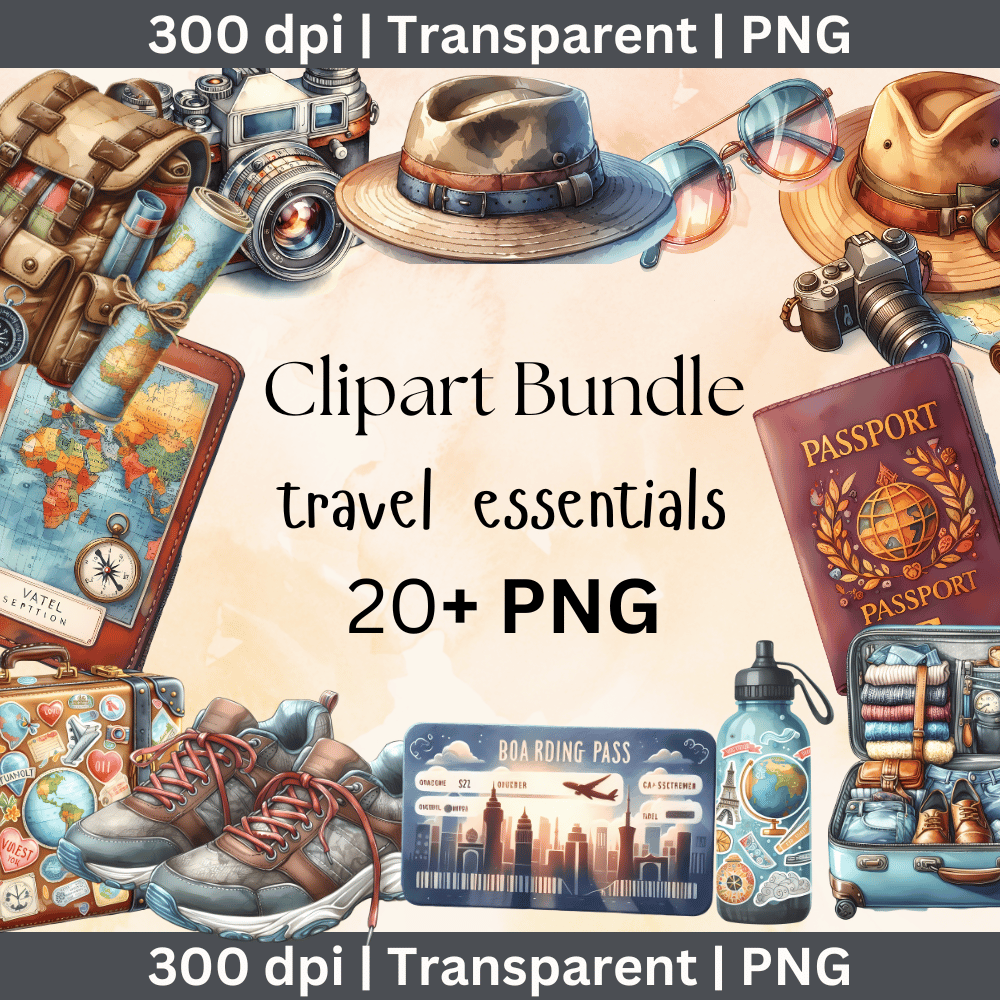 - Over 20 unique, high-quality PNG files of travel essentials in watercolor style