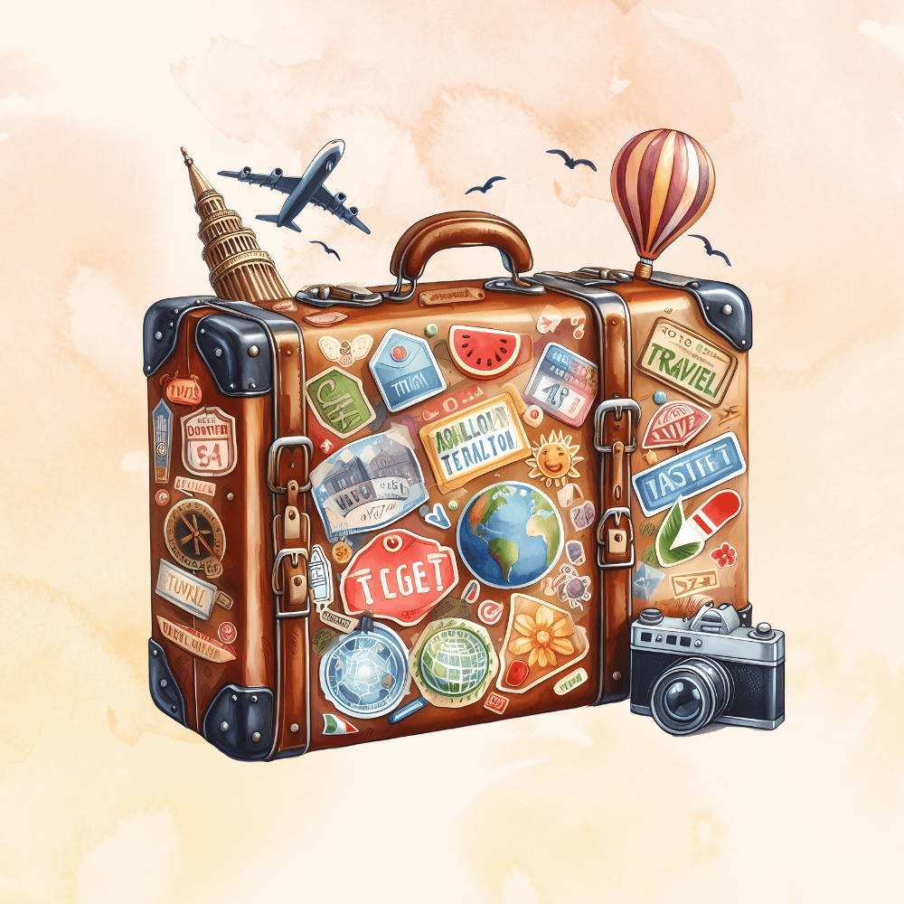 bundle of 20+ watercolor-style travel essentials is perfect for anyone looking to add a touch of wanderlust to their creative projects! From passports and suitcases to travel guides and cozy pillows, this collection has everything you need to capture the essence of adventure and exploration.