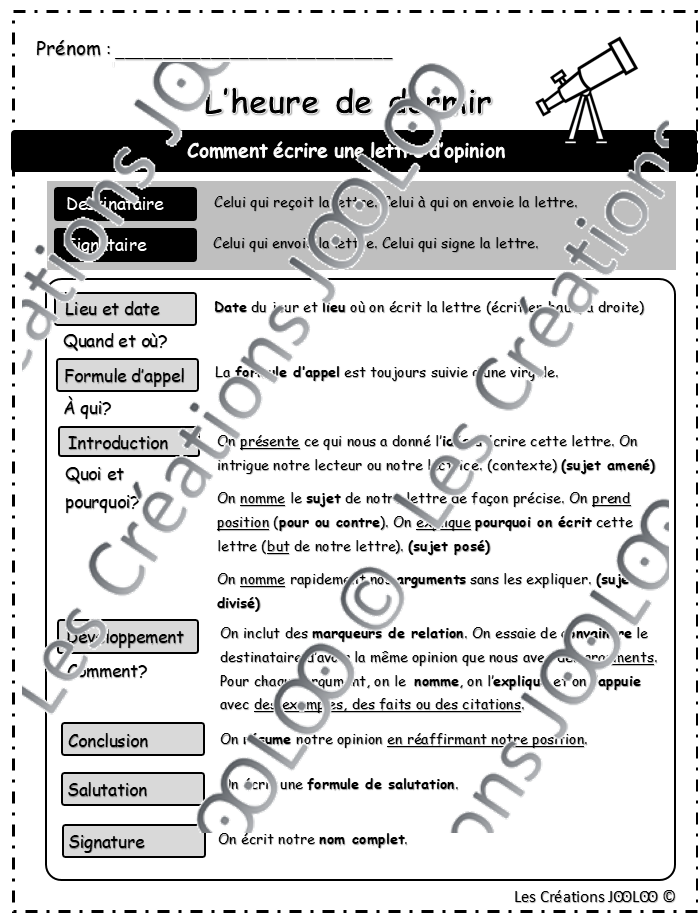 Voici une situation d'écriture clé en main pour les élèves du 3e cycle afin de travailler le texte argumentatif. L'élève doit rédiger une lettre d'opinion avec une introduction, des arguments pour le corps du texte et une conclusion. Il devra aussi inclure la date et le lieu, la formule d'appel et les salutations ainsi que sa signature dans cette lettre. Pour ce faire, à l'aide d'un plan-gabarit et d'une banque d'idées d'arguments, il pourra écrire ses phrases plus facilement.