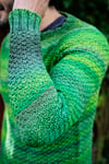 For this reason it is vitally important that you swatch and use the right size needles to get correct gauge in the texture pattern, and for either weight you use, in order to get the correct sized garment. Knitting the garment at the incorrect gauge may result in a sweater that is smaller or larger than intended (and if larger you may not have enough yarn to complete the garment). The recommended needle sizes in the pattern reflect the sizes I used to get gauge.