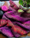 Don’t worry, I kept all the squishy, colorful fun of the shawl version. Speaking of color, for this sample I paired the bright, pink, red, and orange tones of Spincycle’s Dyed in the Wool in “Hotdish” with the chilly, cold-olive of Baby Cat Yarn’s fingering-weight “True Grime Enthusiast”. A retina-searing bright with a nearly neutral? Yes please!