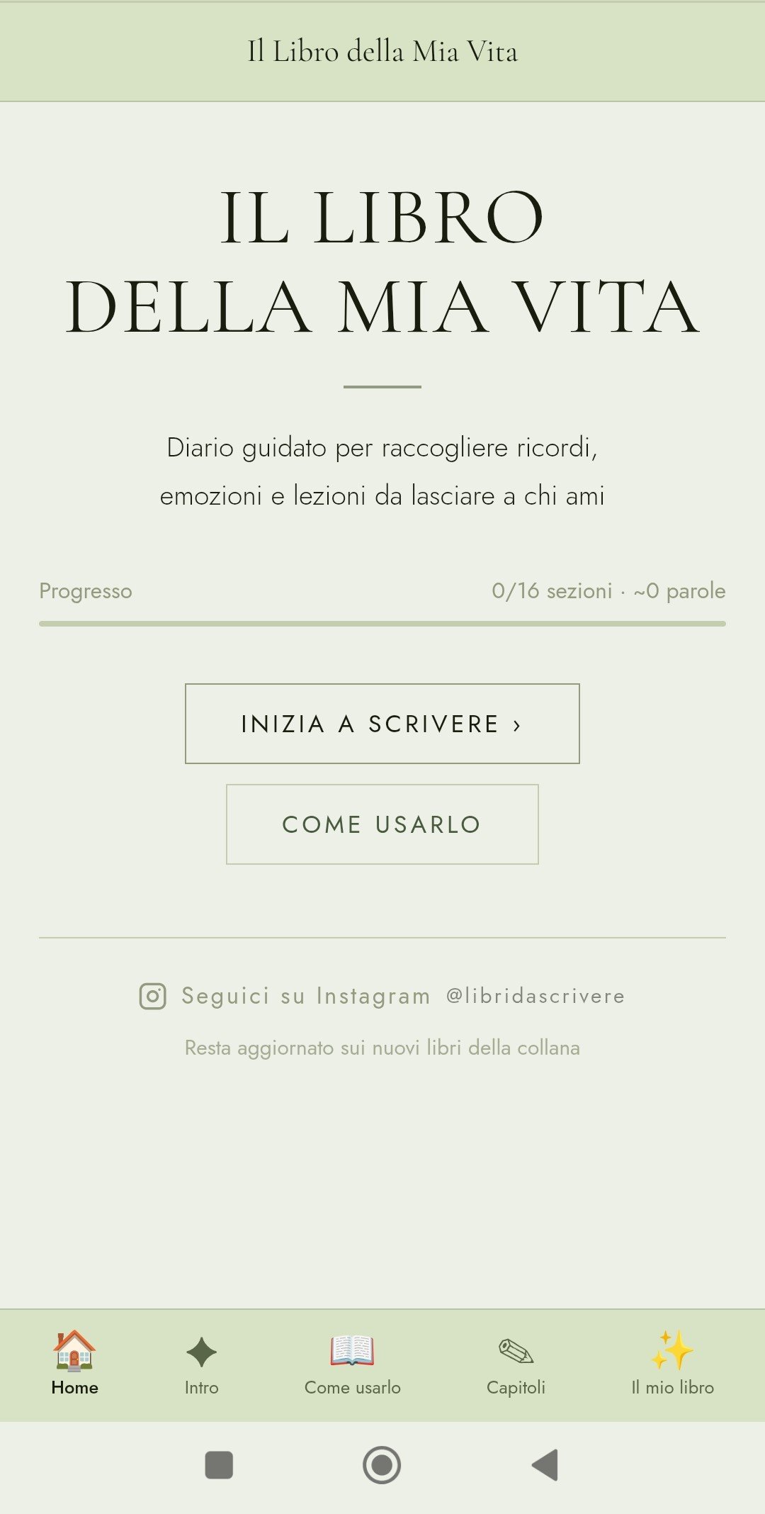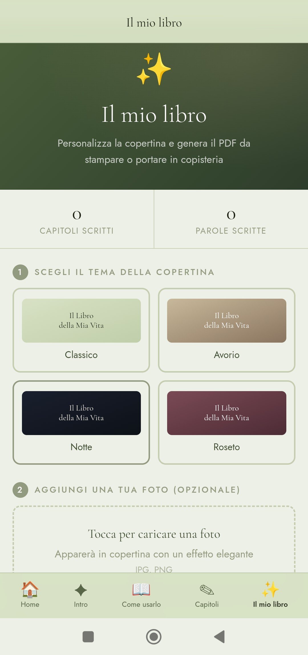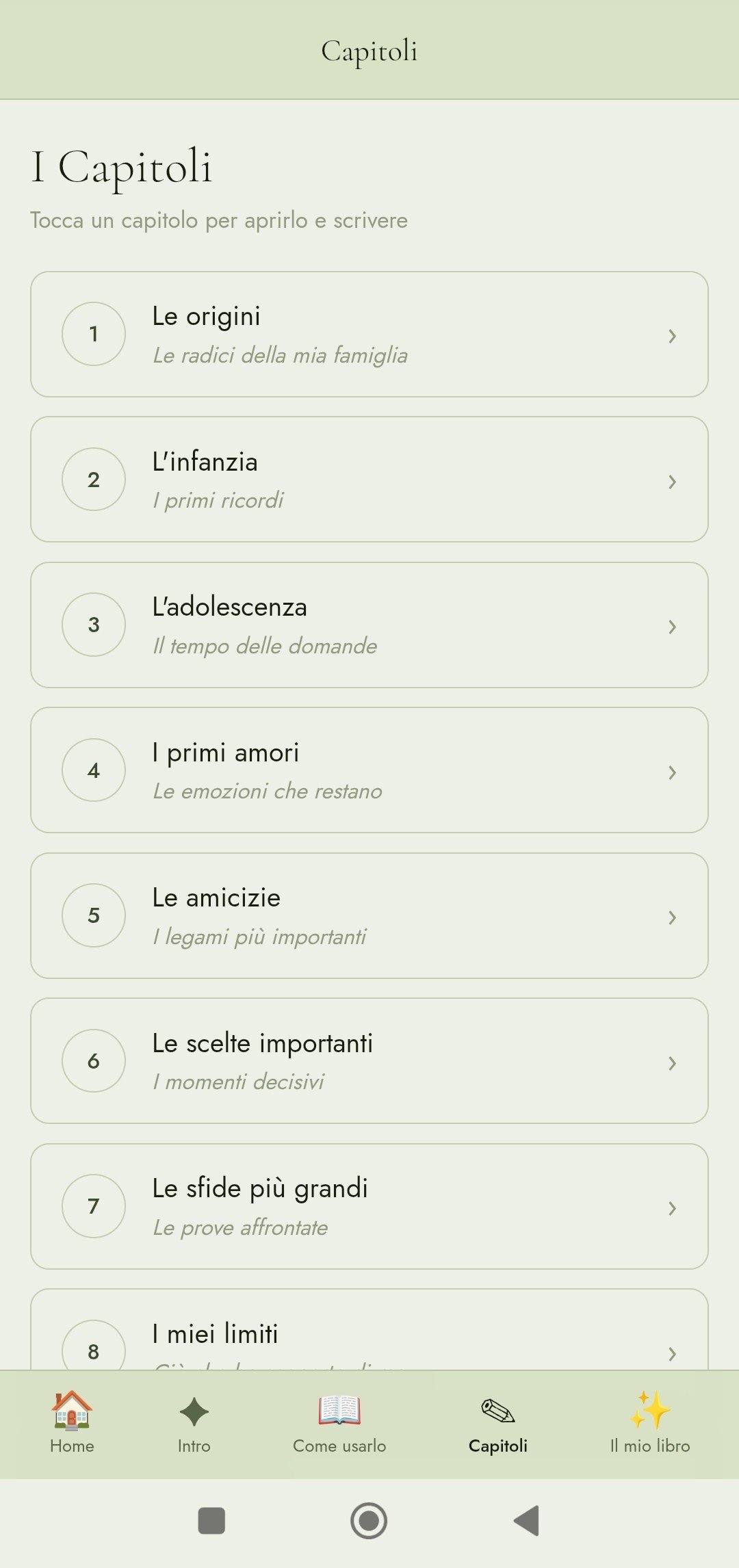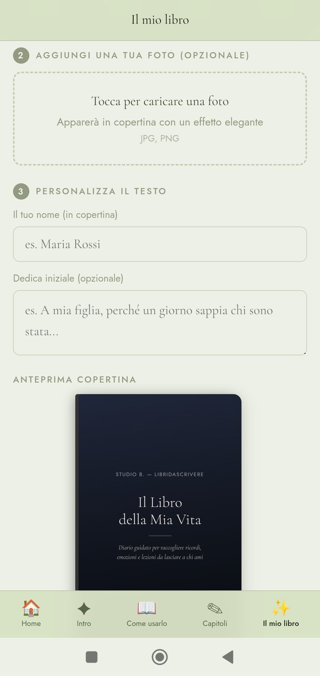 Il Libro della Mia Vita è un diario guidato in 15 capitoli che ti accompagna a esplorare la tua storia: le origini, l'infanzia, i primi amori, le sfide, i successi, le relazioni più importanti.