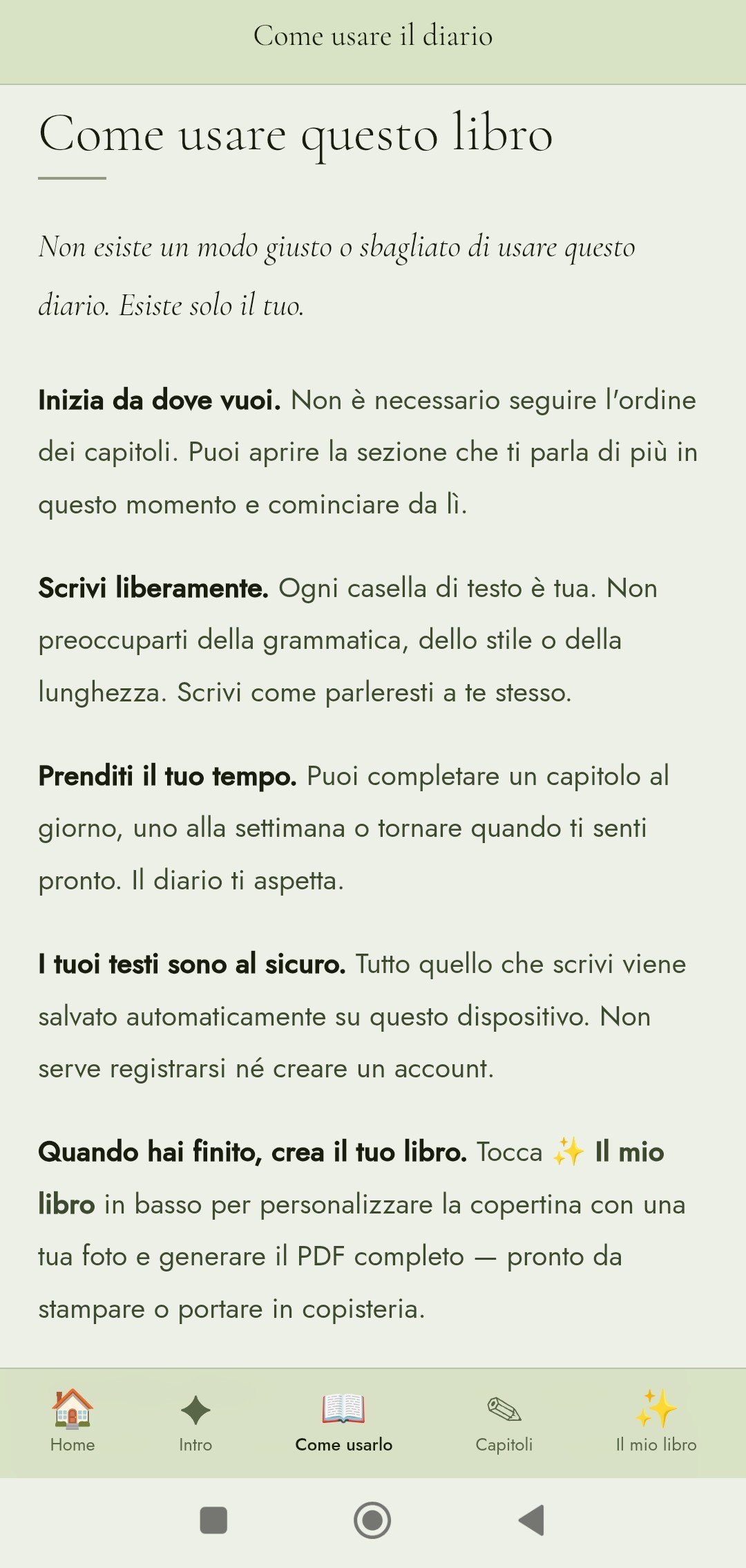 Se utilizzi la versione digitale su telefono, i tuoi scritti saranno presenti solo su quel telefono e in quel browser. Cambiando dispositivo o browser, o cancellando la cache, i dati non saranno più recuperabili. Ti consigliamo di esportare il tuo diario in PDF periodicamente usando la funzione integrata nel prodotto.