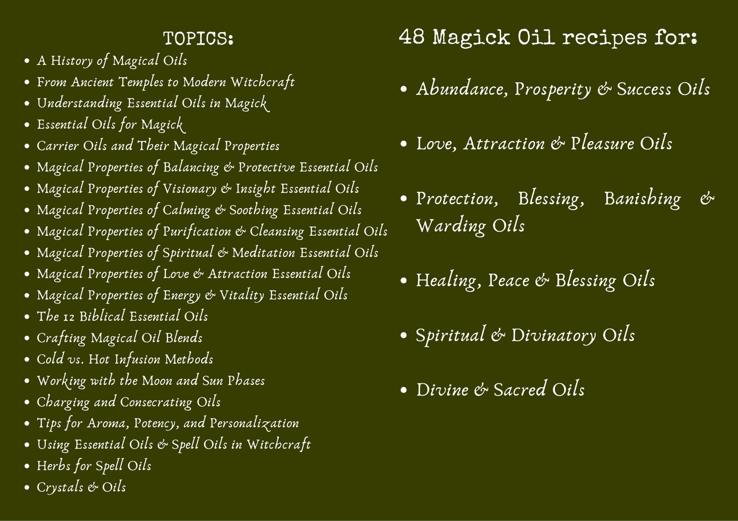 Discover 48 detailed recipes for abundance, love, protection, healing, divination, and sacred rituals.