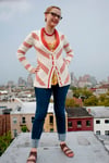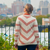 The Delancey Cardigan has a vintage feel with its striking chevron stripe motif and elegant shawl collar. Sections of thin diagonal stripes accentuate the sweater’s unusual zig-zag construction. Slanting stripes, in combination with the long sleek fit, make this a flattering design.