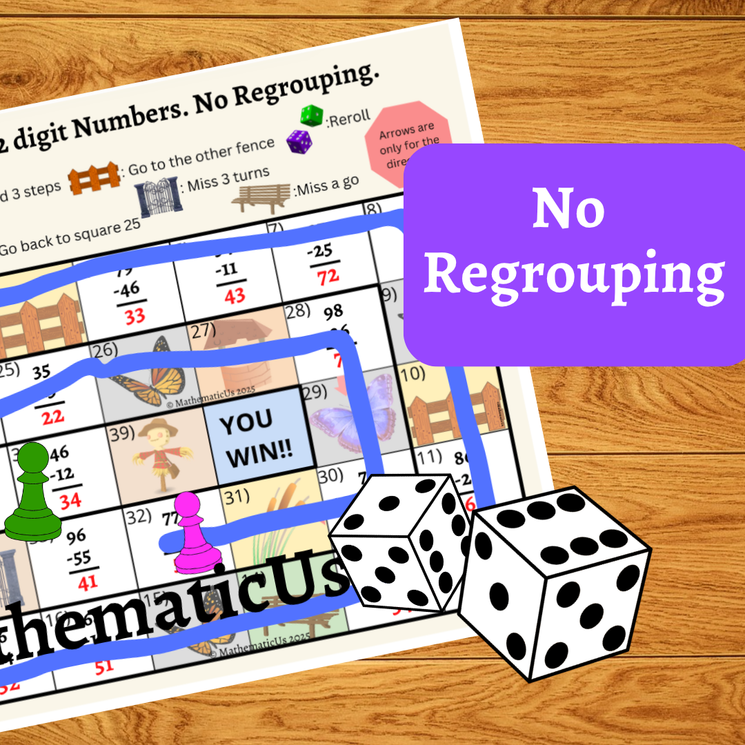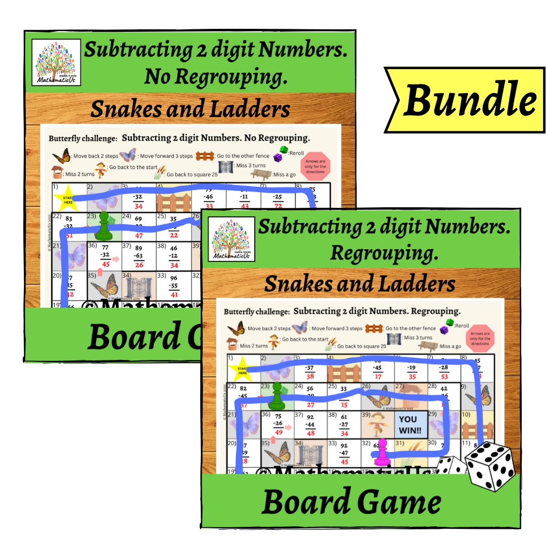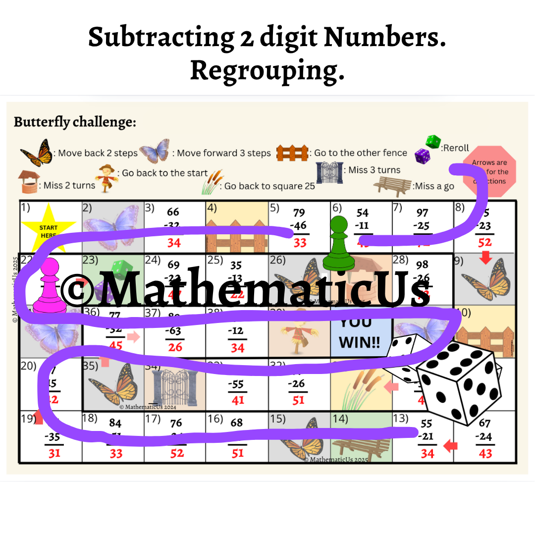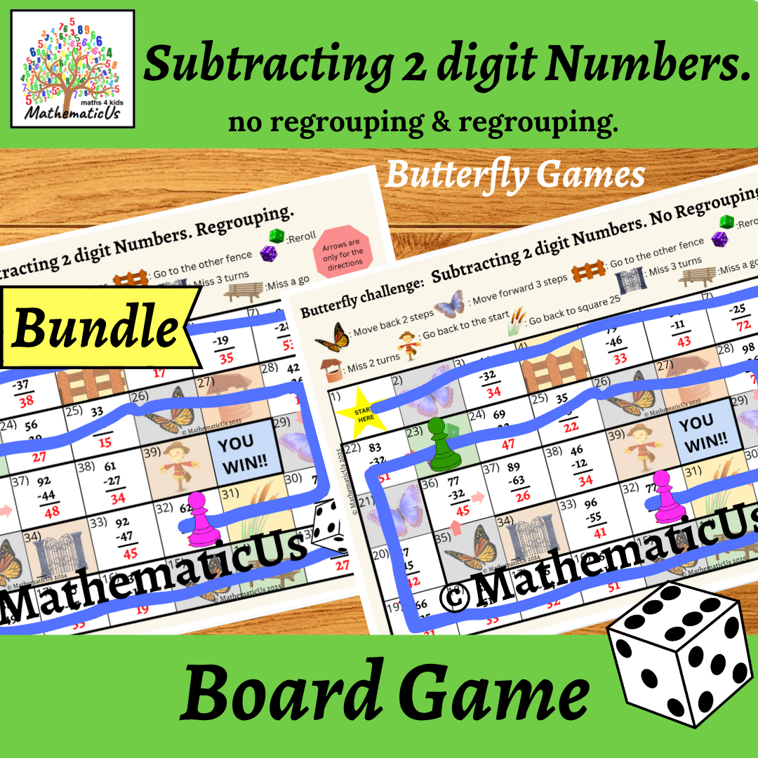 There is the Bundle of 2 Butterfly Board Dice Games for practice with Subtraction 2 digit numbers both without regrouping and using regrouping. Each game was designed to engage student practice more. Those games make learning Addition and Subtraction numbers with regrouping fun and easy for students. Great for classwork, homework, additional practice, and early finishers.