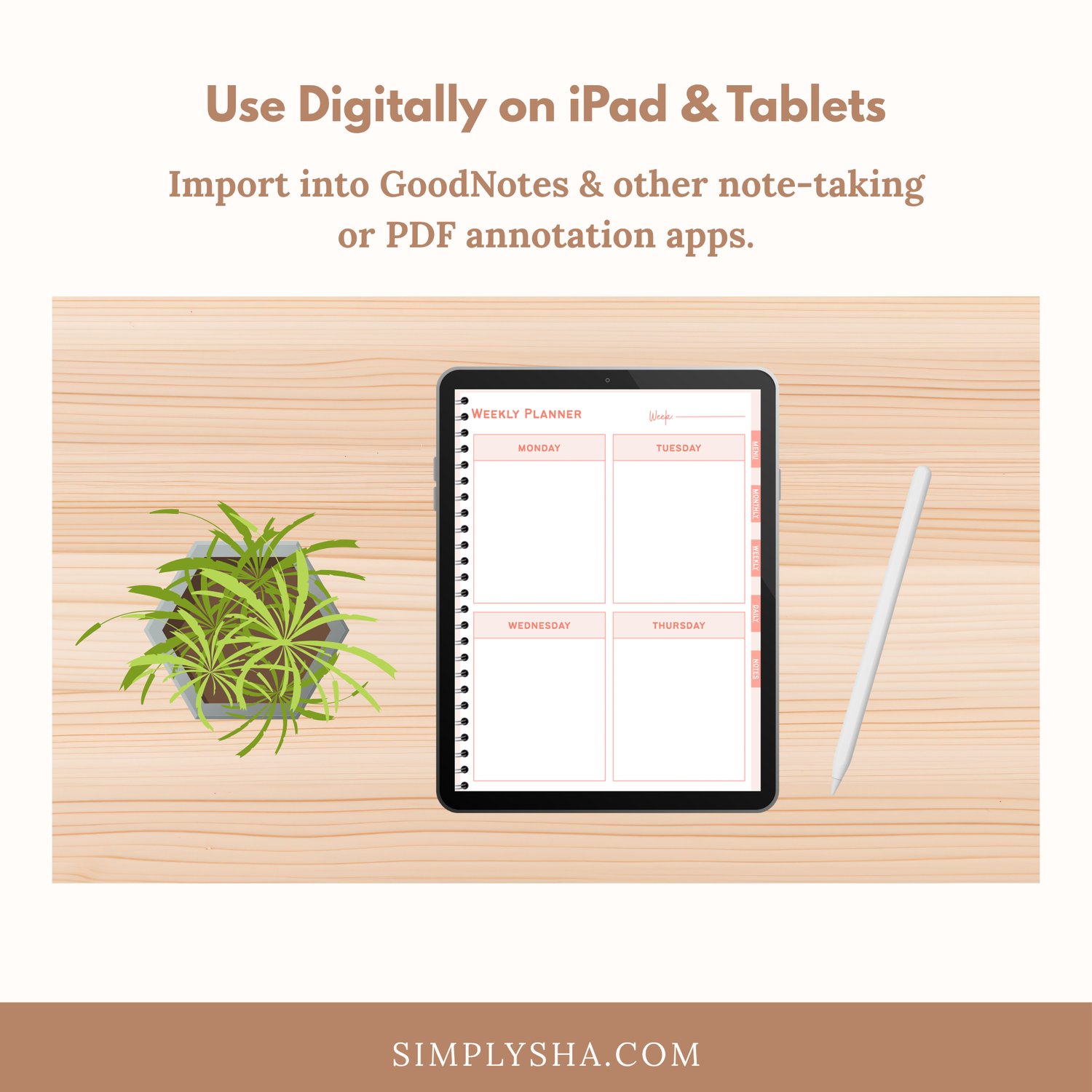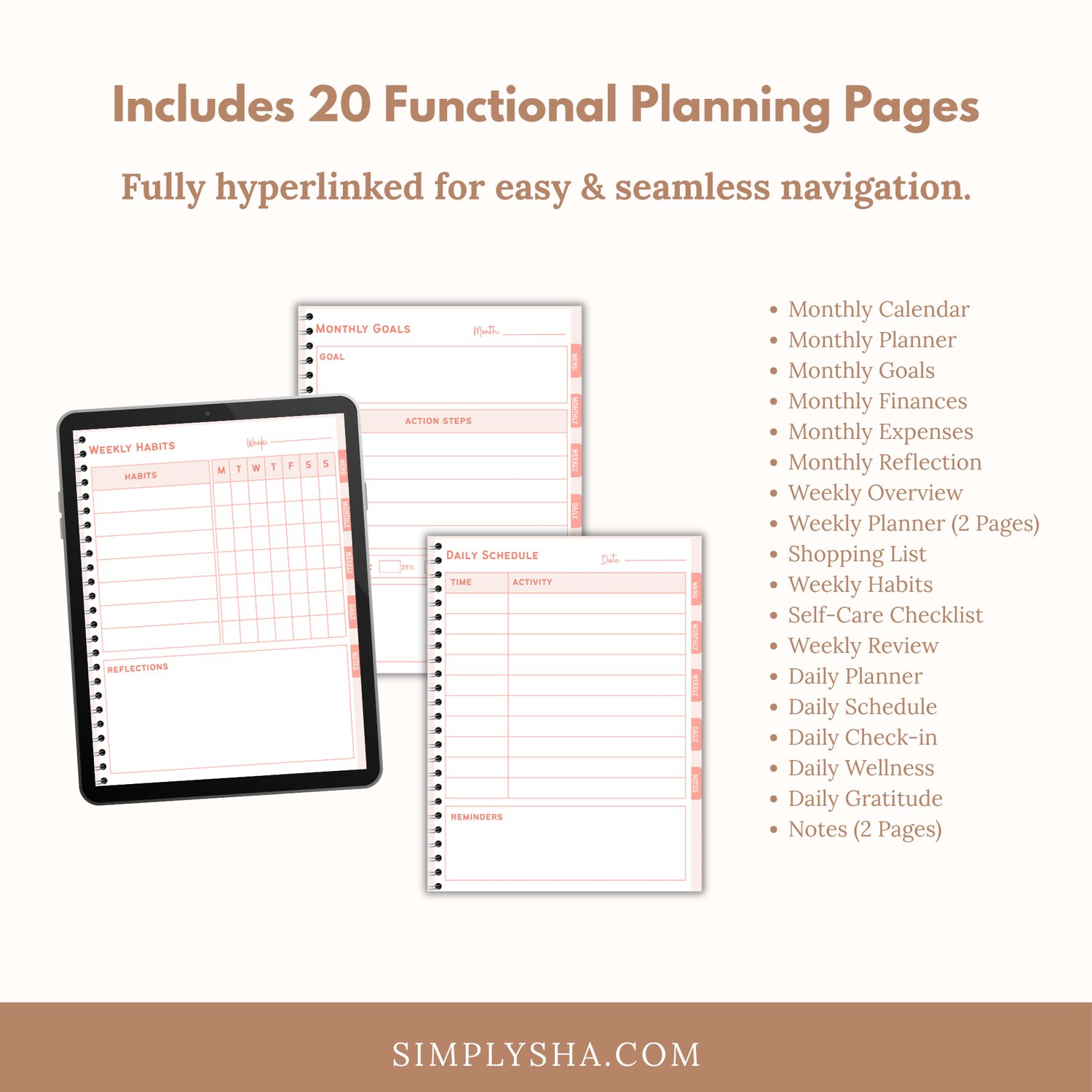 This undated Digital Planner is designed for iPad and tablets. It is fully hyperlinked for easy and seamless navigation, making it perfect for GoodNotes, Notability, Noteshelf, Xodo, and other PDF annotation apps.