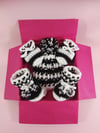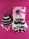 Hand crochet Pompom hat, bootie and mitten set in a soft chunky black and white super soft 100% cotton yarn. Perfect gift for a new baby.