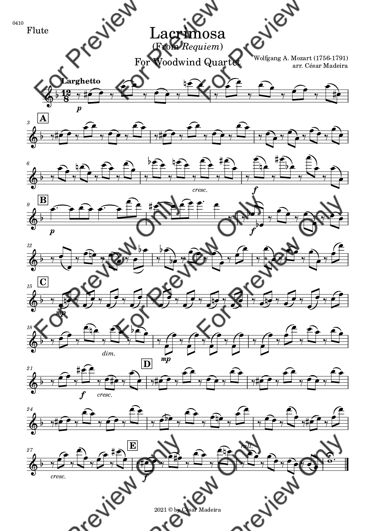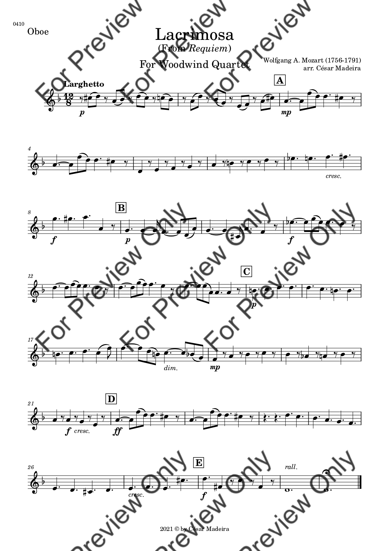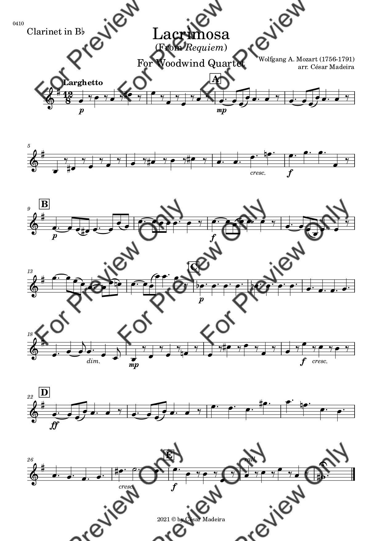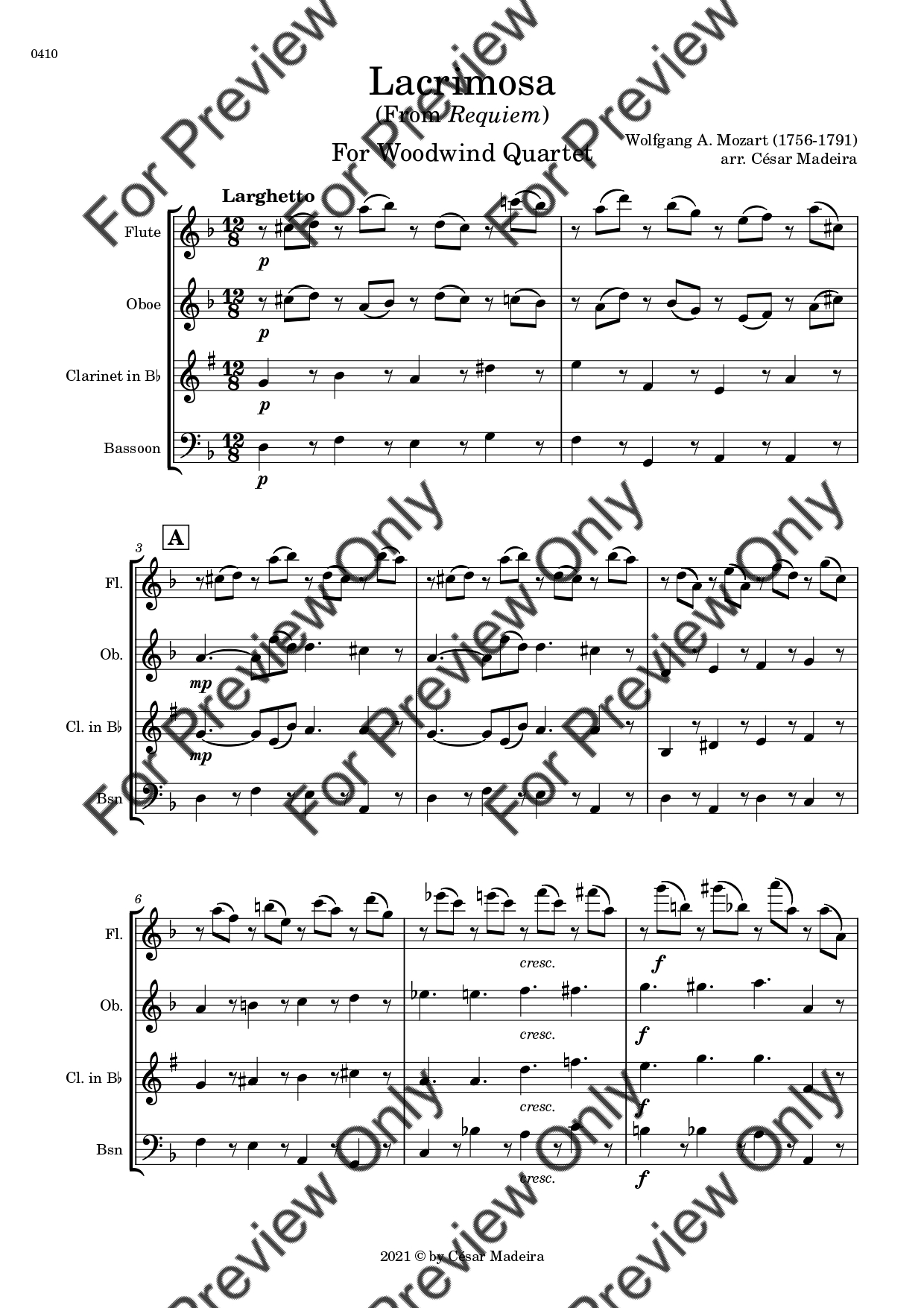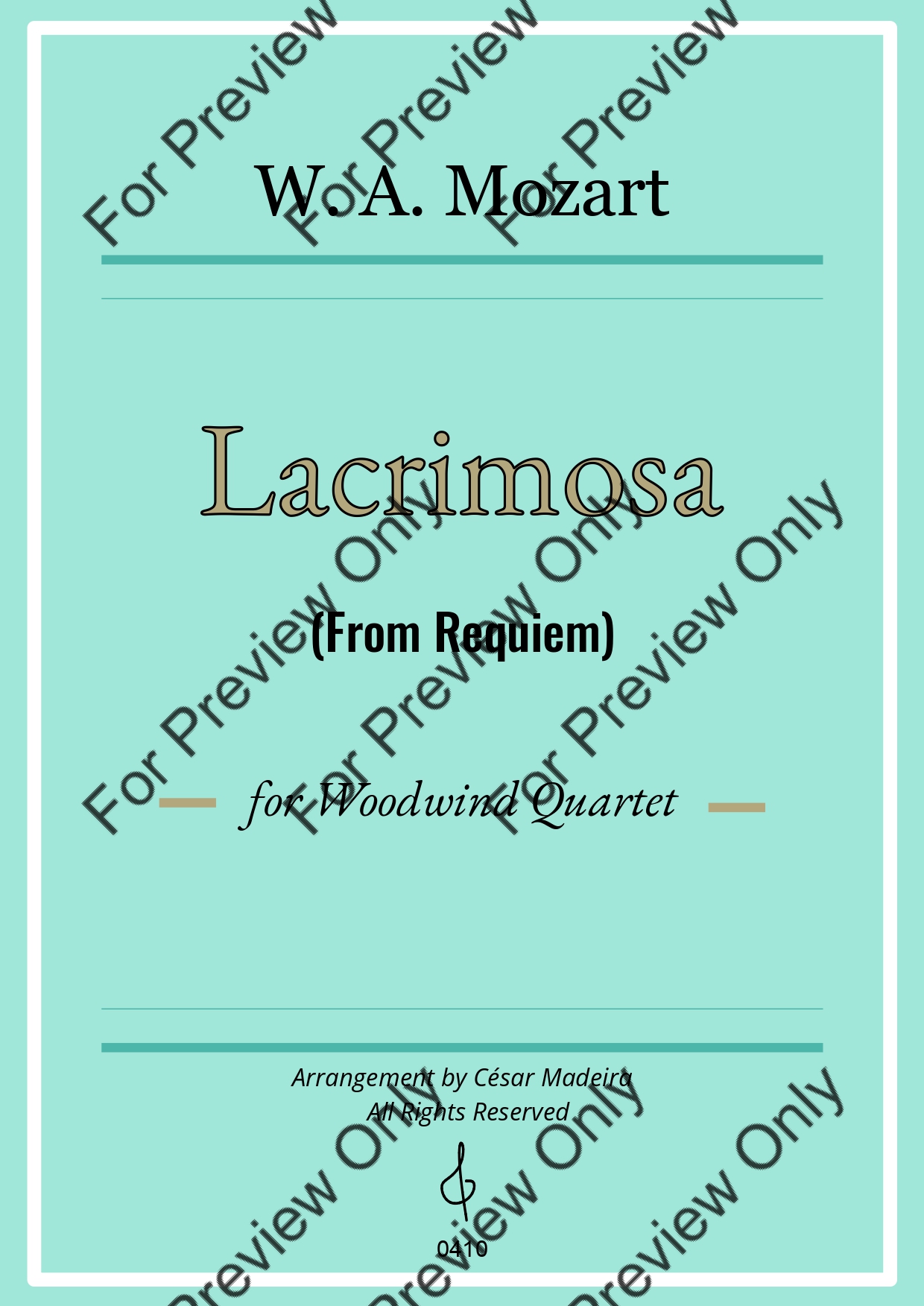 Lacrimosa by Wolfgang Amadeus Mozart. Arrangement for Woodwind Quartet - Flute, Oboe, Bb Clarinet and Bassoon. With Full Score and Individual Parts. Have fun!