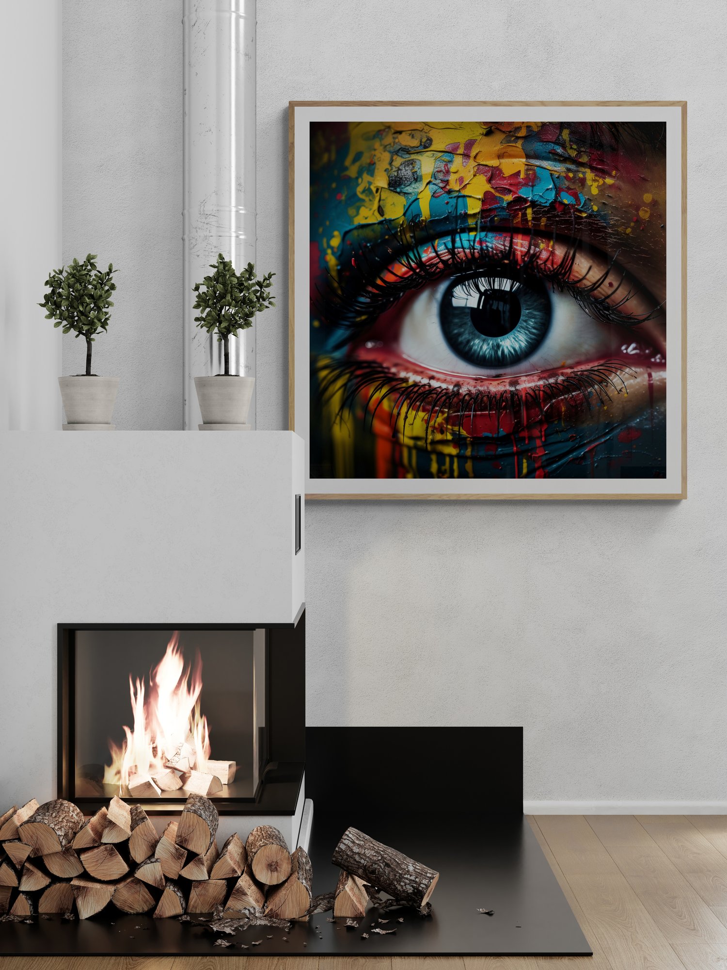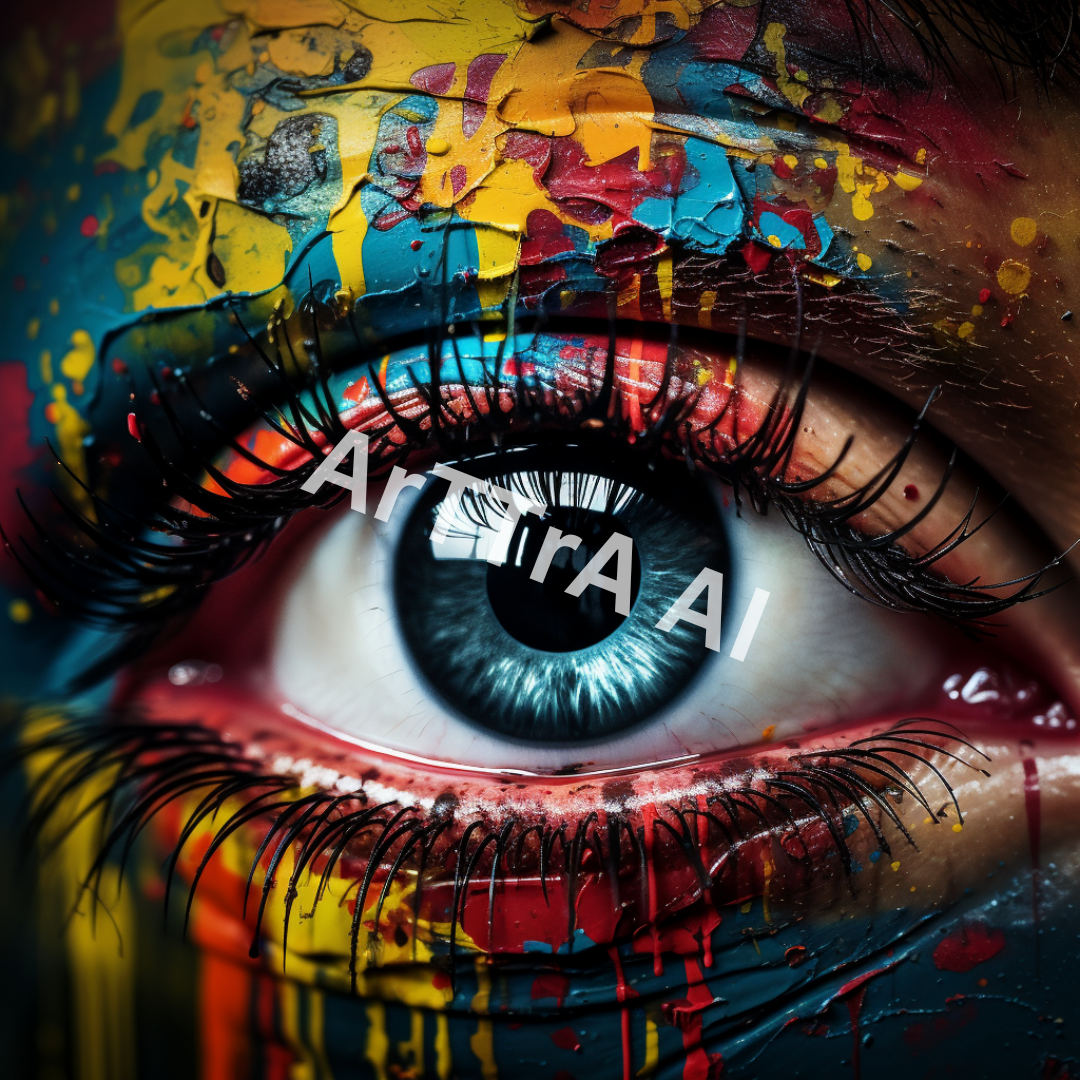 Expressive intersection of art and humanity that captures the intensity of a close-up human eye adorned with vibrant strokes of paint. The emotive power of close-up photography with the innovative strokes of artificial intelligence, resulting in a visual narrative that transforms the eye into a captivating canvas.