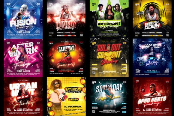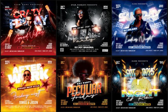 Crafted in ready-to-edit PSD files, all the main components of these elements are effortlessly modifiable to meet your unique requirements. Inherent features include easy customization and editability in a compact design measuring 4.25”x4.25” with a bleed setting of 0.25 inches. Designed in vibrant CMYK color and a print-ready format, these templates set the perfect tone for a vibrant night out.