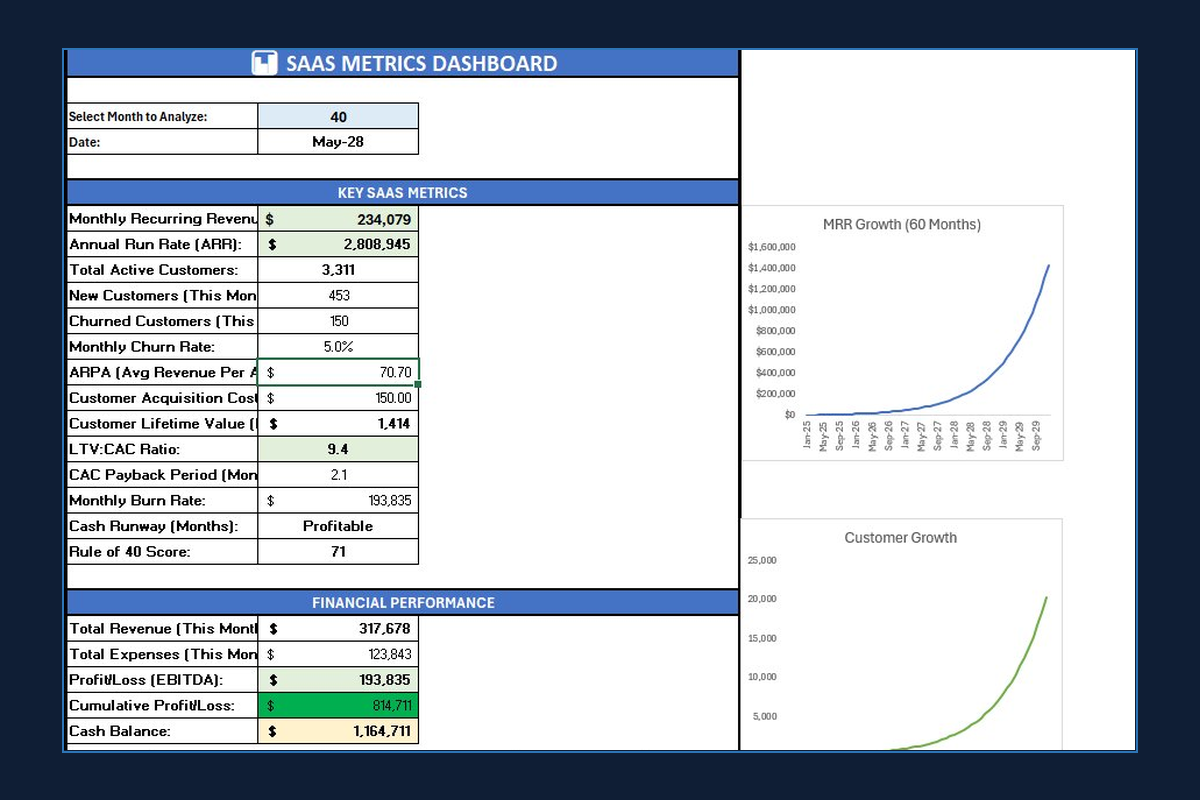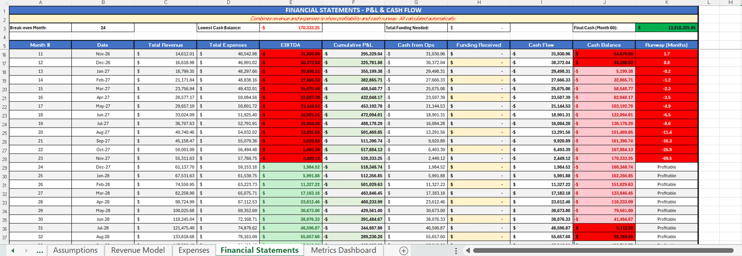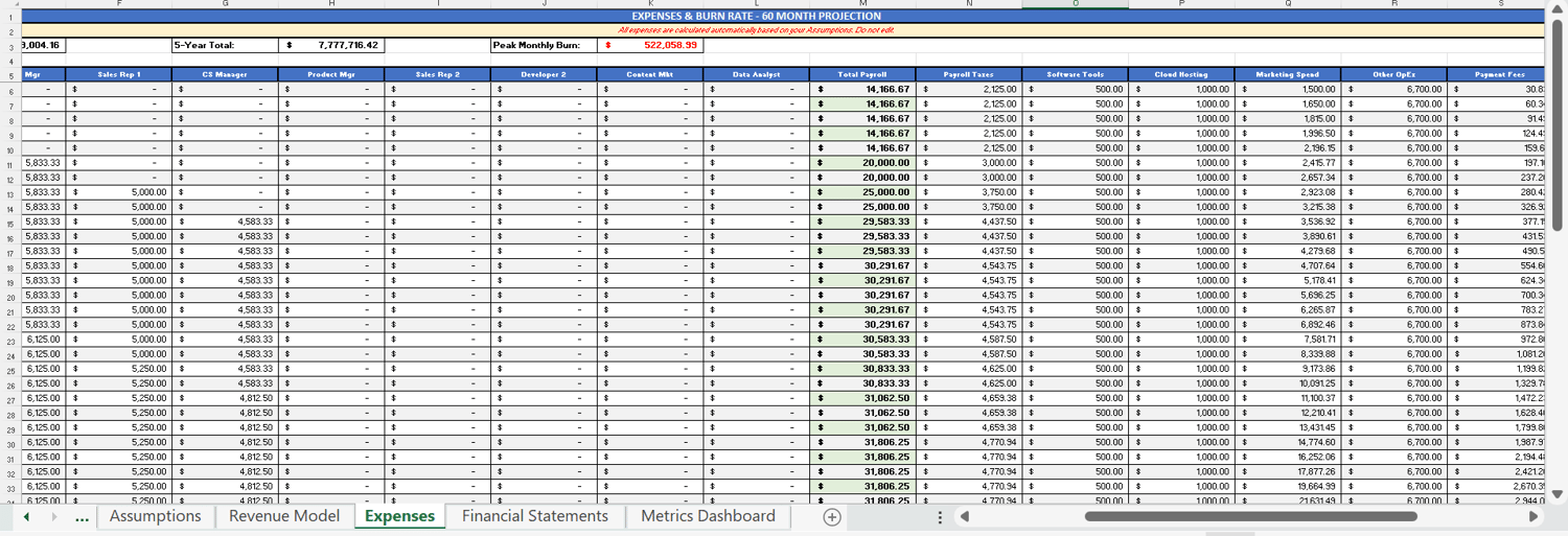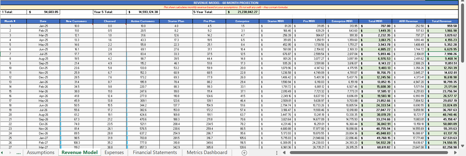 - 60-month revenue projections (MRR & ARR tracking)