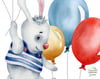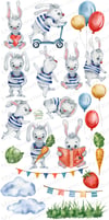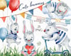 Cute funny bunnies. Kids birthday party decor and nursery decoration set: air balloons, scooter, flags, clouds, vegetables and bunnies in various poses