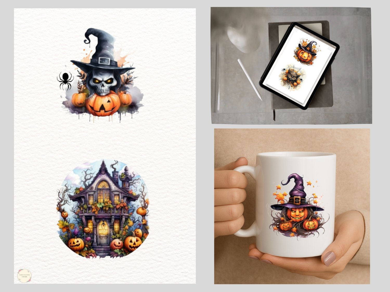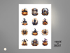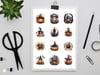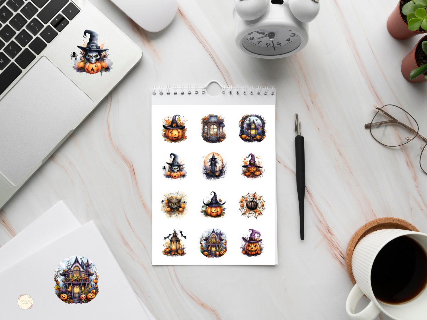 Watercolor Halloween Sticker Sheet – Cat in Web, Witch & Pumpkins with Witch Hats