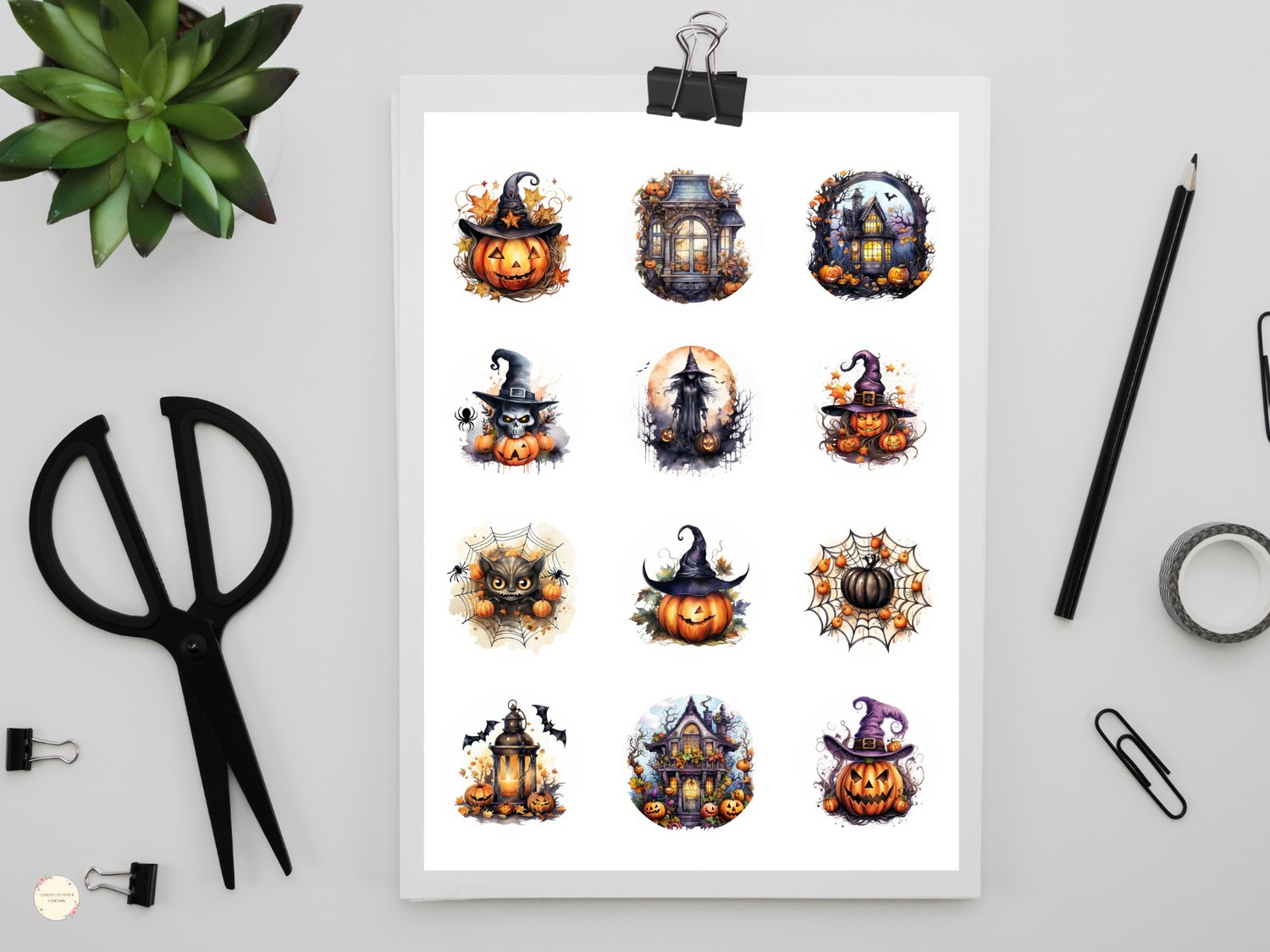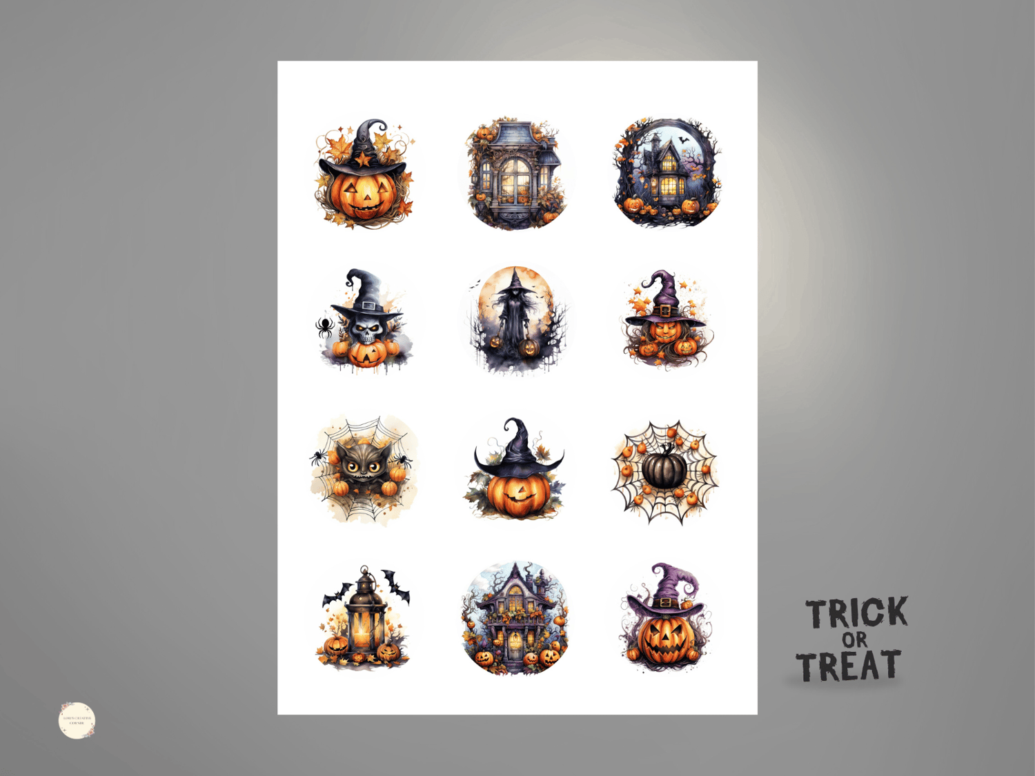 Add a truly whimsical touch to Halloween with this delightful Watercolor Halloween Sticker Sheet! Featuring unique,watercolor designs, including a charming cat nestled in a web, a witch, and adorable pumpkins donning witch hats, these stickers are perfect for adding a touch of magic to your planners, scrapbooking projects, DIY crafts, notebooks, and so much more. Simply print at home on your favorite sticker paper, cut, and start decorating all your spooky projects!