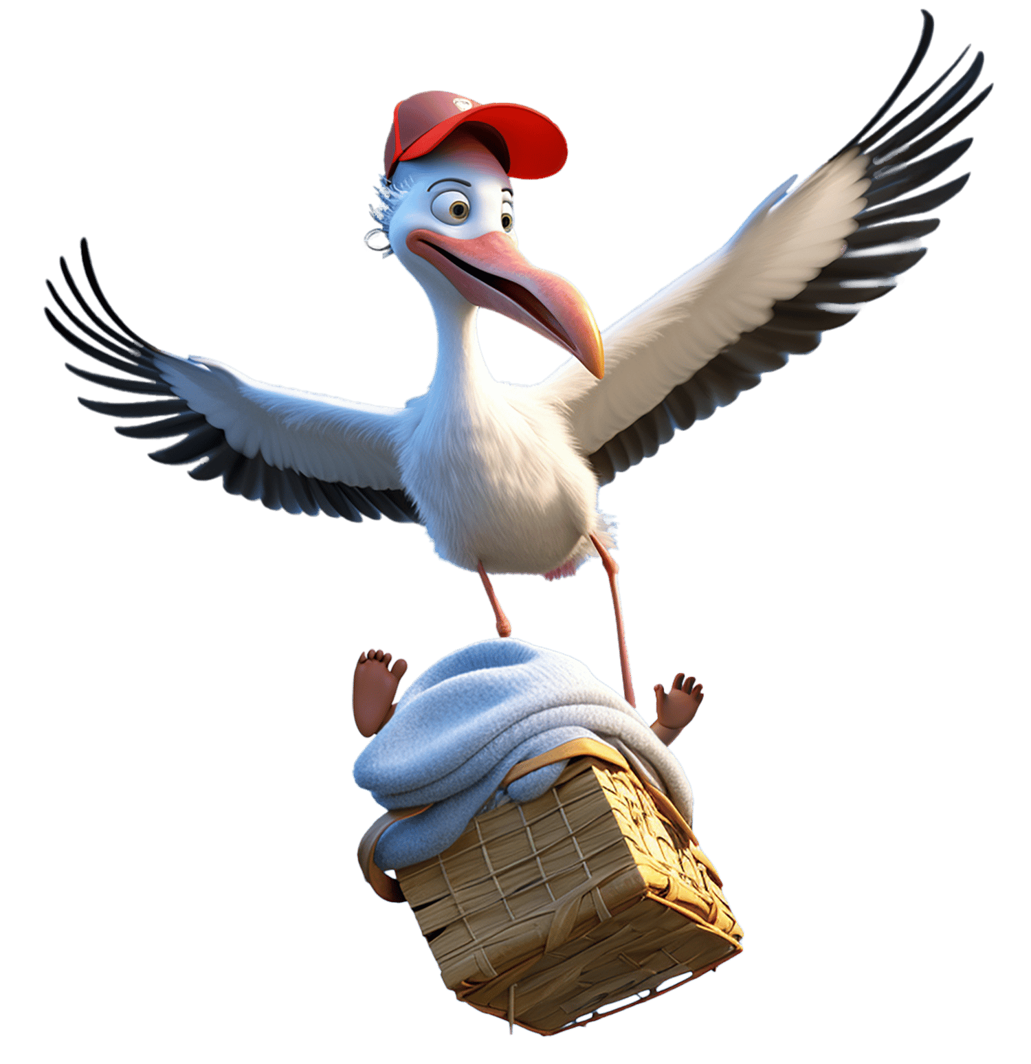 In the delightful cartoon image, a whimsical stork steals the spotlight as it soars through the sky wearing a cheerful red delivery hat. Clutched in its feet is a charming basket of joy destined for new parents eagerly awaiting the arrival of their bundle of happiness.