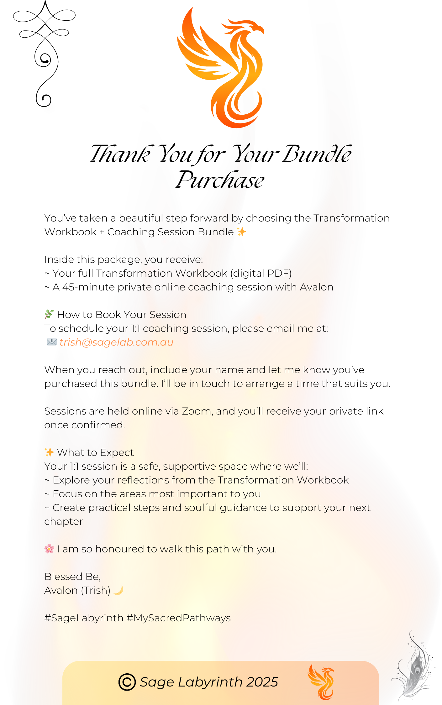 The Transformation Bundle combines the full Transformation Workbook (75-page guided coaching workbook) with a 45-minute private online coaching session with Avalon.