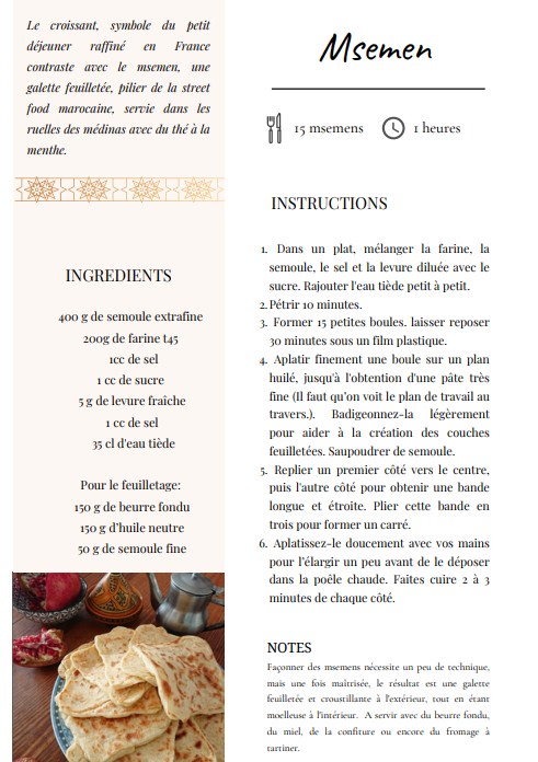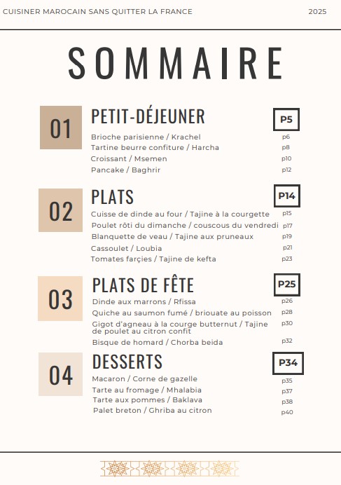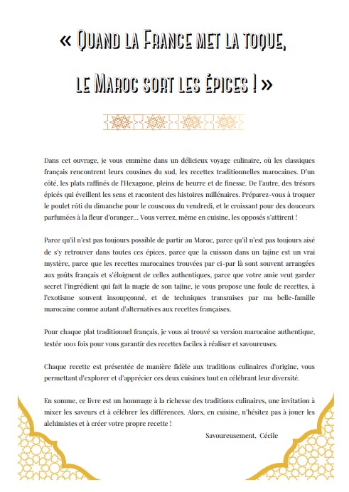 Dans cet ebook, embarquez pour un voyage gourmand où les plats raffinés français rencontrent les délices épicés du Maroc. Imaginez troquer votre poulet rôti du dimanche 🍗 contre un couscous parfumé 🍛 ou un croissant 🥐 contre des douceurs à la fleur d’oranger 🍊… Ce livre vous propose des recettes authentiques, facilement réalisables, qui allient finesse et exotisme.
