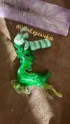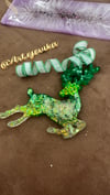 This elegant handmade Christmas ornament in the shape of a deer brings a touch of winter magic. The transparent resin is adorned with emerald and golden glitter, reminiscent of the sparkling lights of a festive Christmas tree.