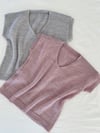 The twisted rib detail of the shoulders and hem are connected with twisted rib faux side seams. It is finished with short, ribbed sleeves which may be lengthened to your sleeve length preference.