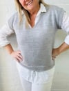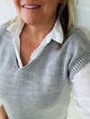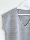 Enola V is worked in one piece, from the top down. Commencing with the back and then front neck, it is worked in the flat back and forth until arm holes are created. Short rows are incorporated after the shoulder rib detail. It is then joined in the round and worked to the hem for either a straight body or waist shaped option.