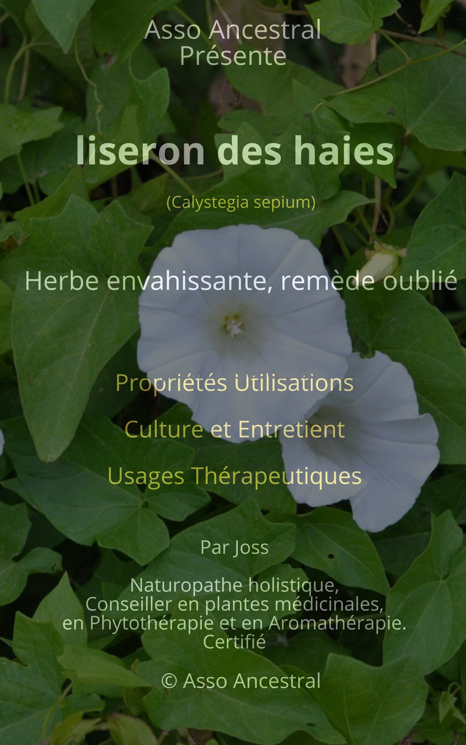 Ce livre vous propose une exploration complète, à la fois pratique et poétique, de Calystegia sepium, le liseron des haies, plante grimpante des campagnes, souvent perçue comme envahissante, mais dotée de vertus médicinales discrètes et oubliées :