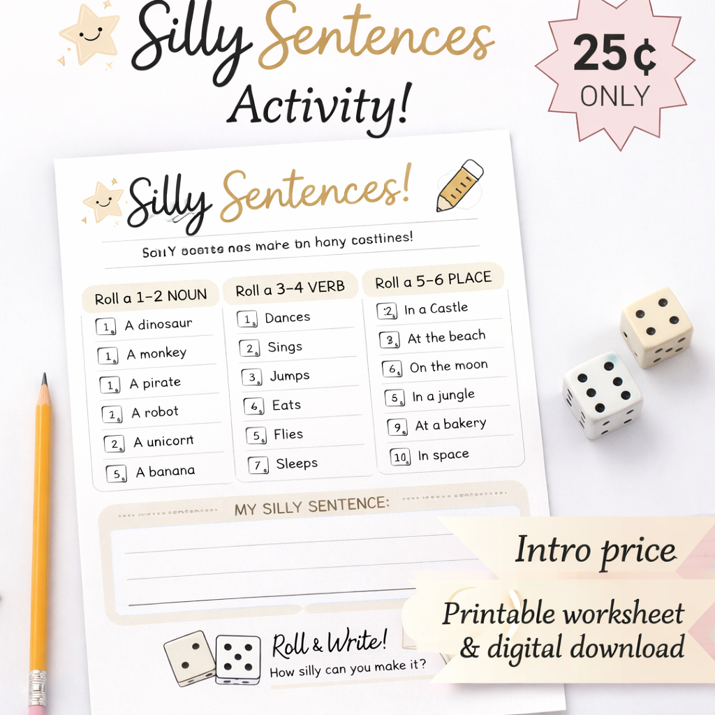 Silly Sentences! Roll & Write Worksheet (A4 Printable)