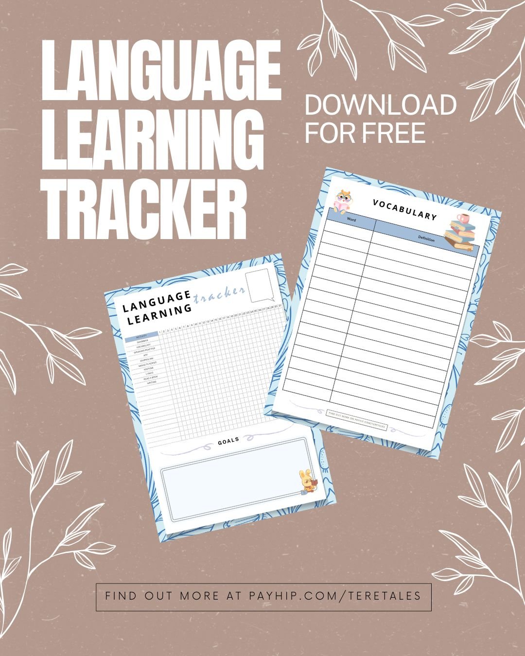 Track your language learning progress with this free Language Learning Tracker with a tracker and a vocabulary page.