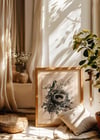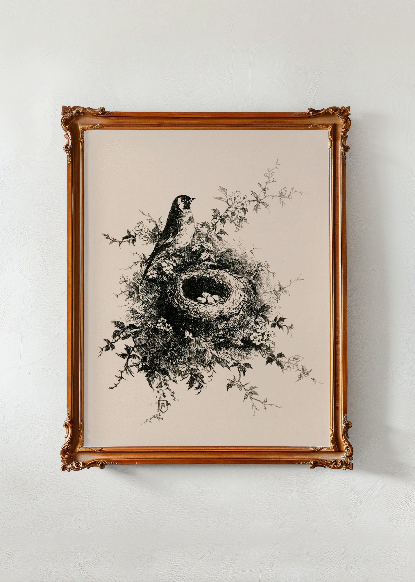 The flowers around the nest bloom in grayscale, delicate and understated, like whispered lullabies. Each leaf curls with purpose, each petal poised in timeless pause. The composition is simple, yet sacred—a moment most might miss, preserved in soot and shadow.