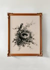 Nest, Nestled Stillness— In the hush of graphite tones, a small bird perches above its nest, the curve of its form drawn with tender restraint. There is no flourish here, only stillness—soft feathers rendered in strokes so quiet they seem to breathe. Beneath her, the nest cradles its fragile promise: speckled eggs tucked among twigs, petals, and bits of green, gathered with care from the wild.