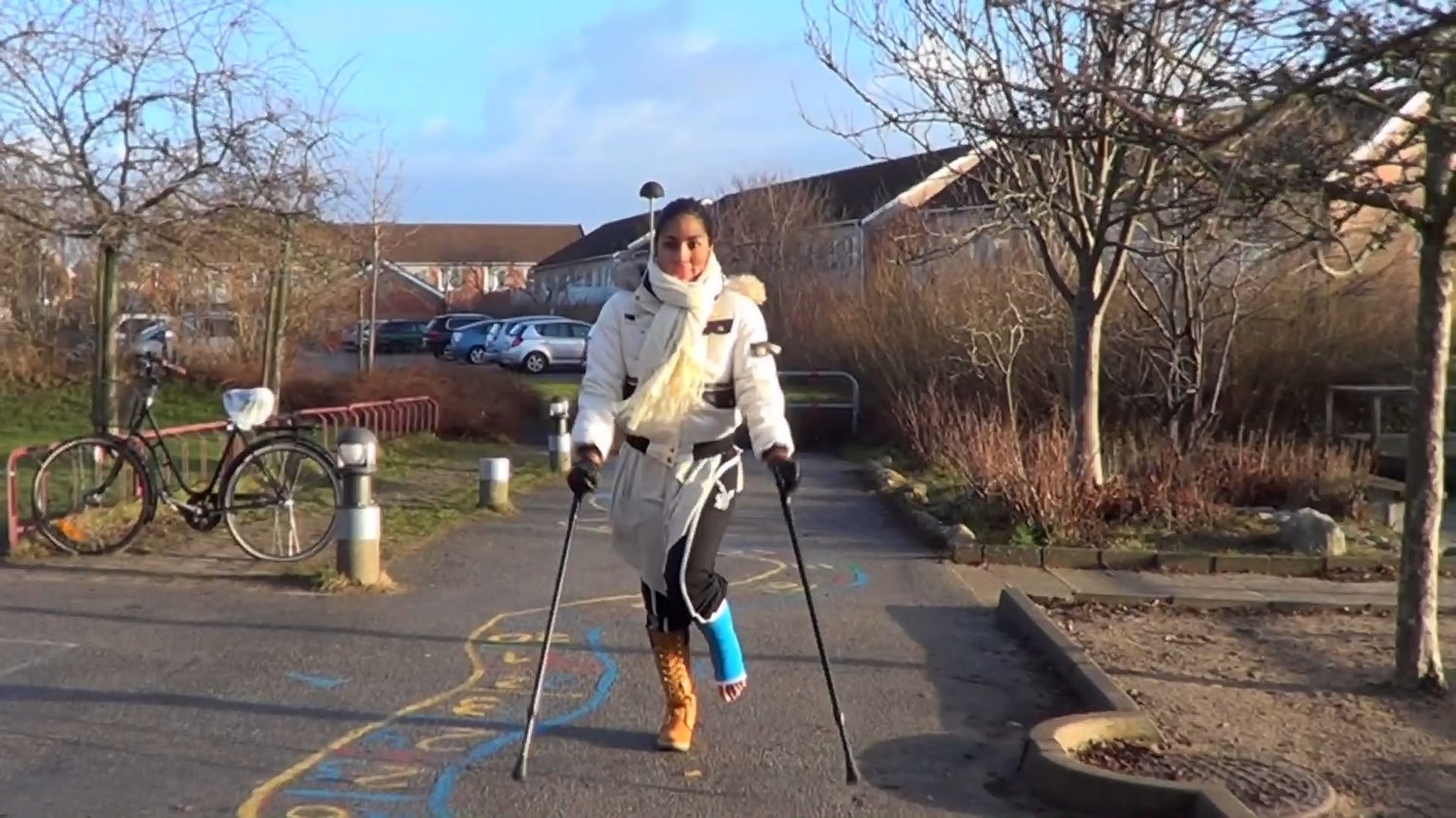 This clip starts with La India almost falling when she is about to start crutching.She saves the situation and crutch on the walkway before she stops and puts her casted foot up on her boot in a closeup.Great crutching clip with La India.