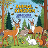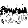 This is a black-and-white illustration featuring a peaceful woodland scene filled with animals and natural elements. The image includes:
