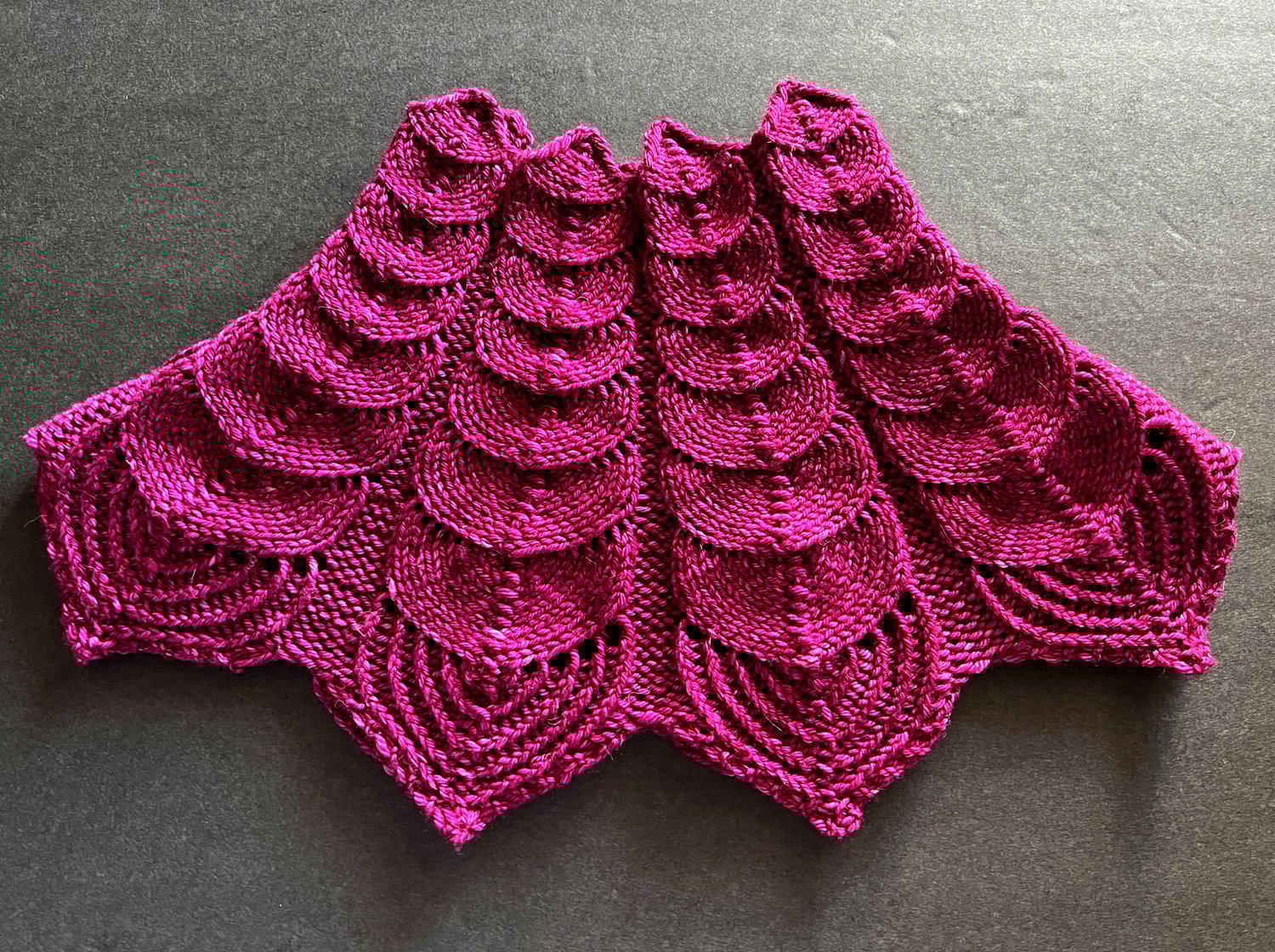 Skills: Work in Round, Work Flat, Unusual Stitch Constructions Directional YO Closures. ICDD (aka s2kp), k, k1 elongated, ktbl, L&R lifted p, p3tog tbl, p, ptbl, sk2p, yo, YO twisted R&L (Directional YO Closures).