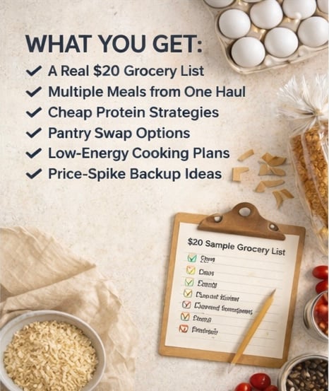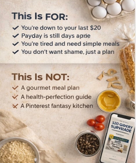 This is a realistic, no-BS survival plan for getting through the next stretch of life on about $20 — without extreme couponing, weird ingredients, or pretending you suddenly love cooking.