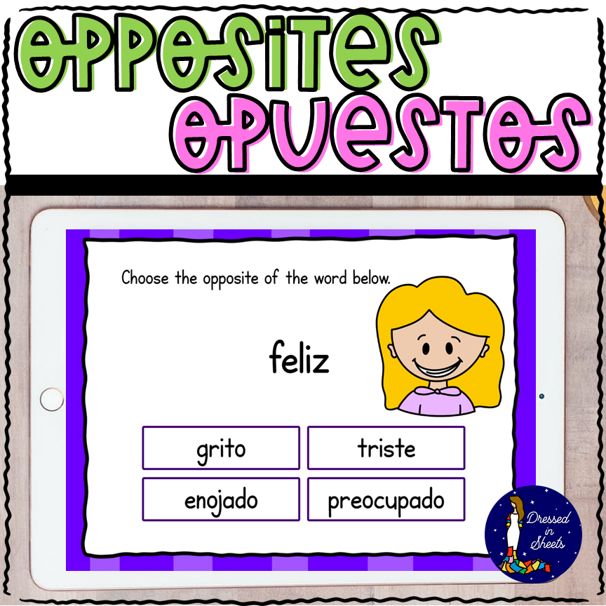 Can your kiddos tell which one of the multiple choice answers is the opposite? Students will read a word and decide which of the choices is the opposite of the word shown. This set includes two (2) BOOM decks students can use. One deck is in English and one is in Spanish. All the words are the same in both decks that way bilingual students can get additional practice.