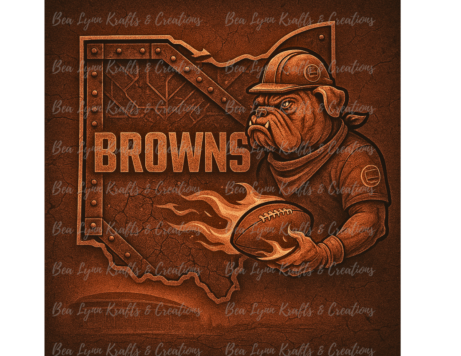 Dawg Pound, STAND UP! This gritty, industrial-themed PNG image explodes with Cleveland Browns energy! Featuring a steel-plated Ohio state outline, a fierce bulldog in game-ready gear, and a flaming football clenched in his paw, this design is all attitude and loyalty. Set against a cracked, battle-hardened texture and anchored by the Browns stadium below, this is the ultimate graphic for true Cleveland warriors who live for Sunday smash-mouth football!