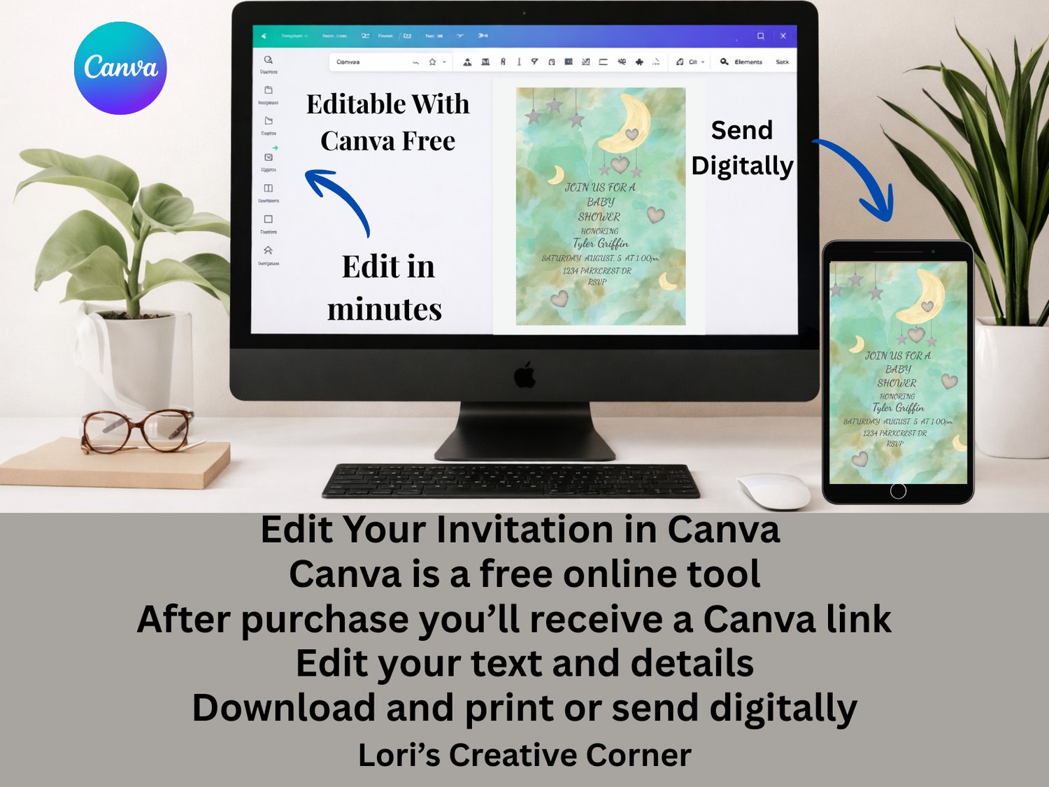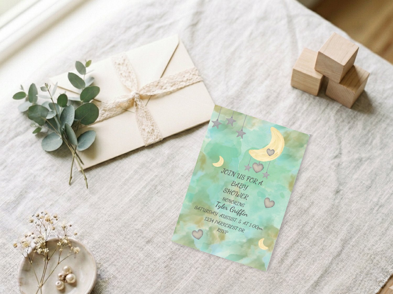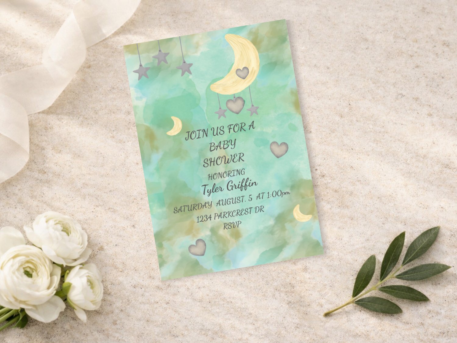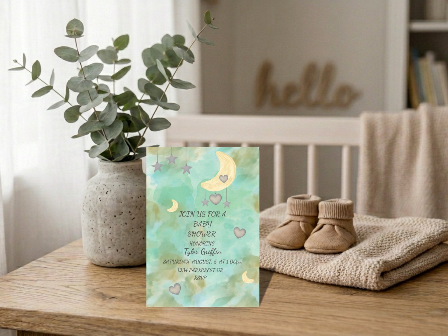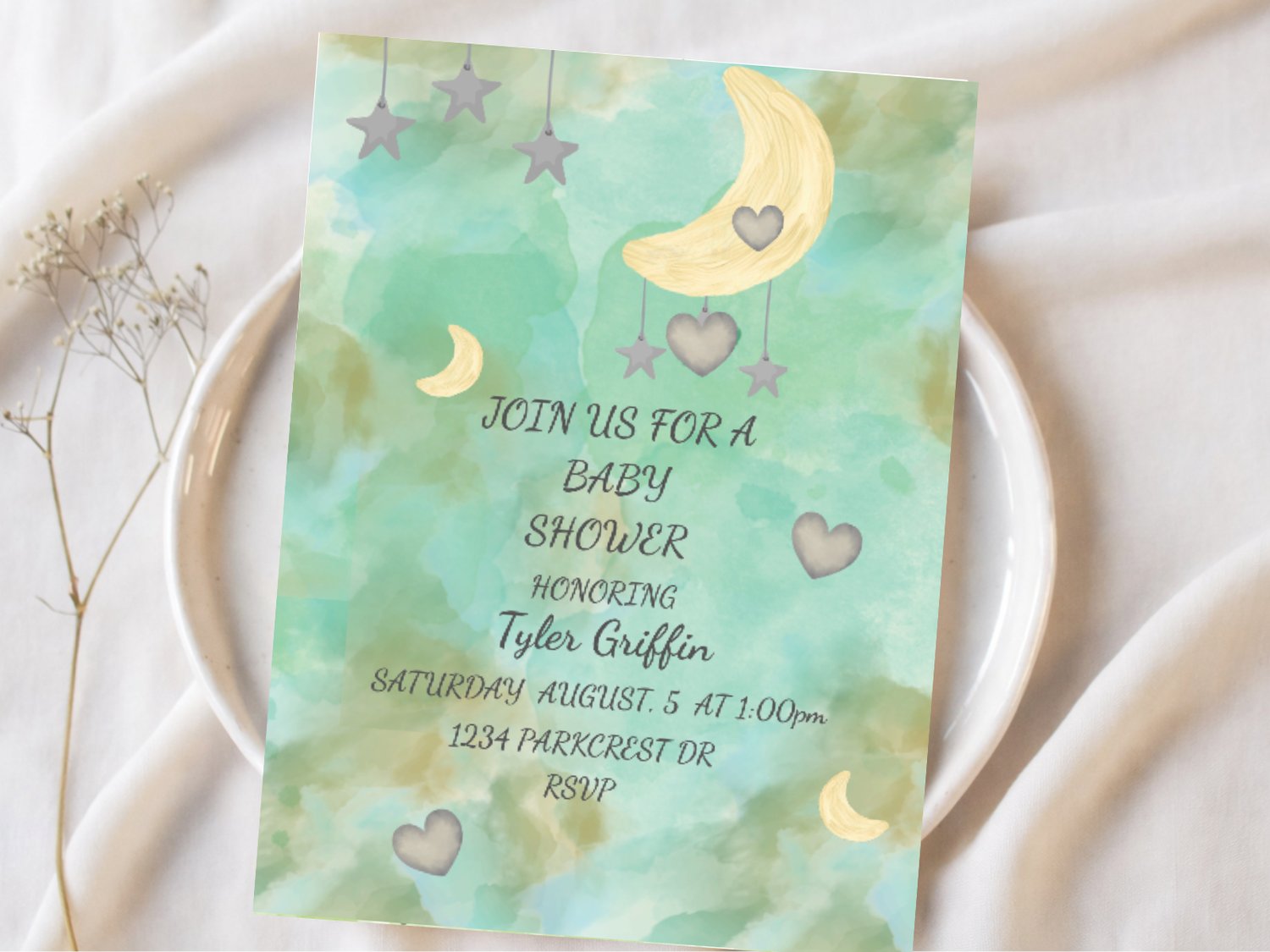Celebrate the upcoming arrival of your little one with this dreamy Moon & Stars Baby Shower Invitation. Designed with soft watercolor tones and a touch of celestial charm, this editable invitation is perfect for a gender-neutral baby shower or a moon-themed celebration. Easily customize your details in Canva and print or send digitally β quick, simple, and beautiful.