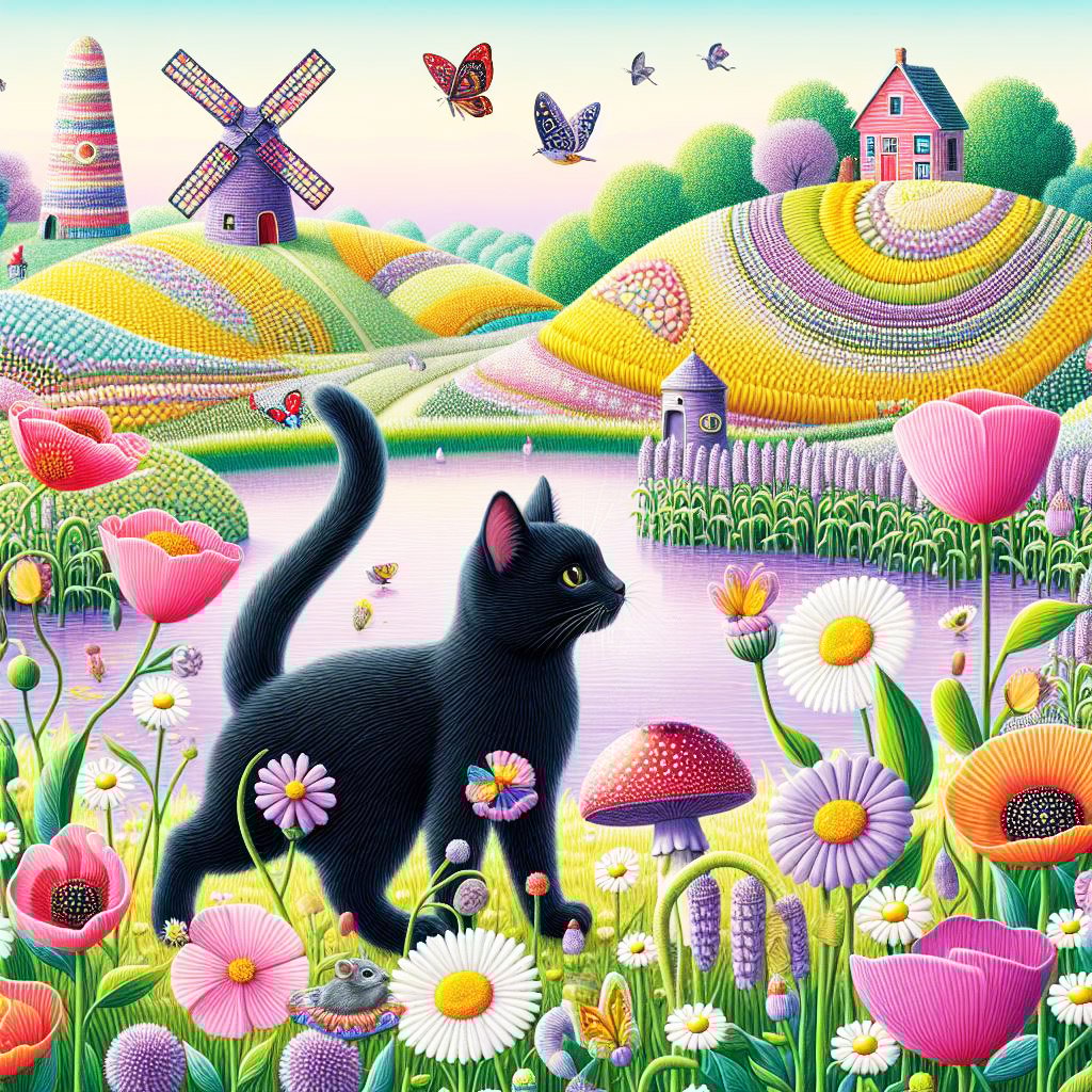 A black cat wandering through a corn field on high patterned hills with poppies, daisies, & toadstools. There are humming birds & butterflies. There is a colourful windmill & a mouse hides in a flower.
