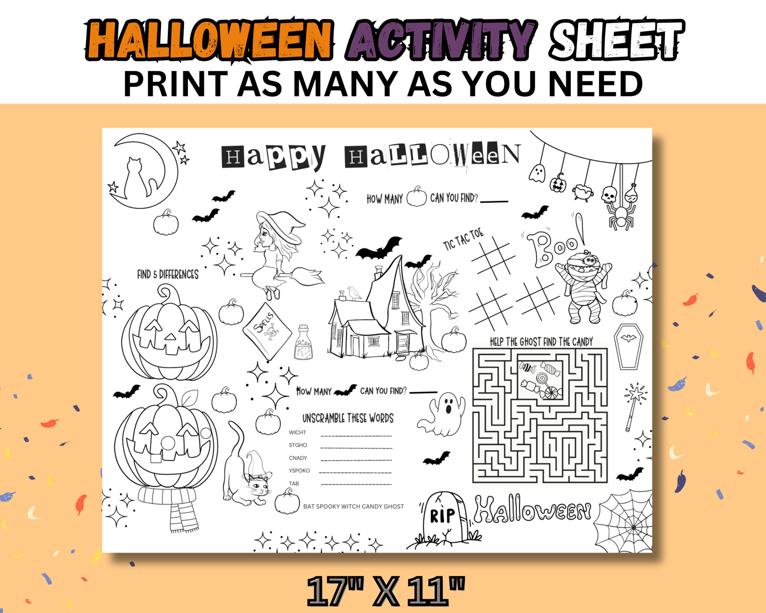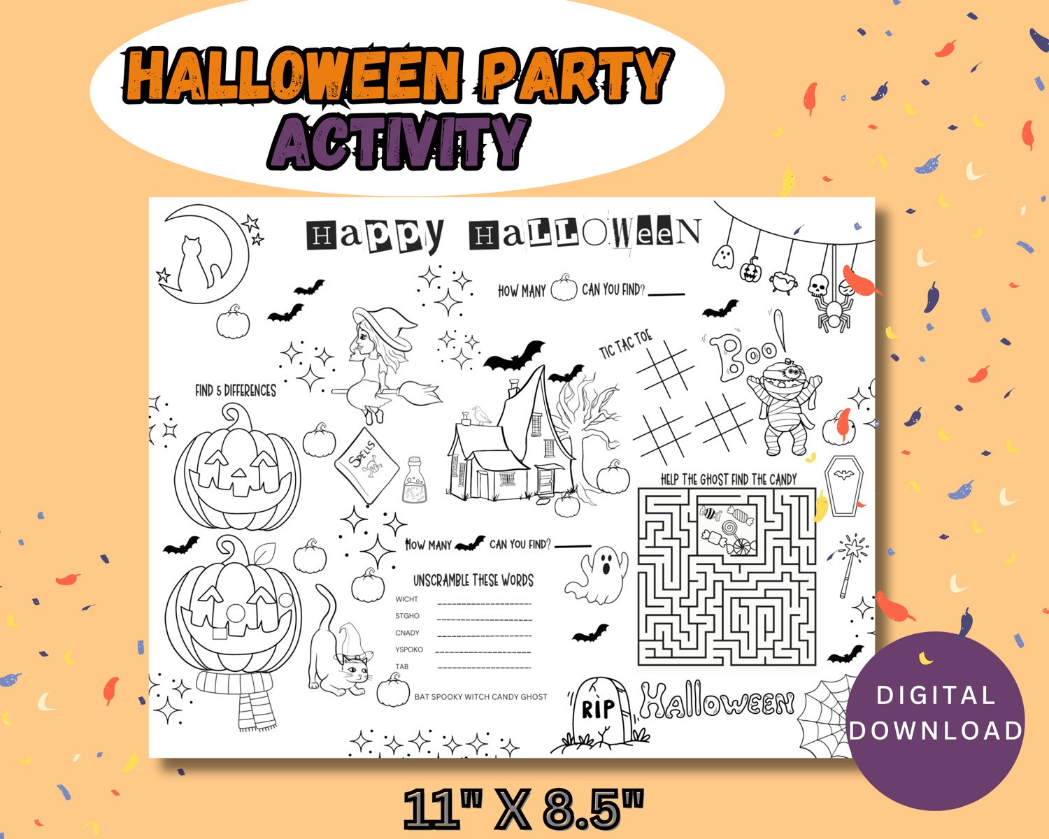 Halloween Coloring Table Placemat, Printable Party Coloring Activity Sheet