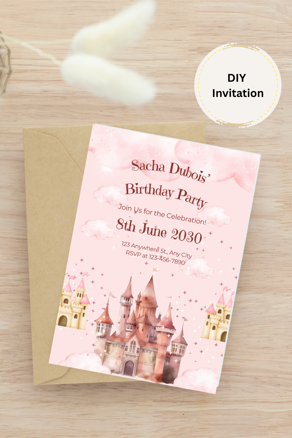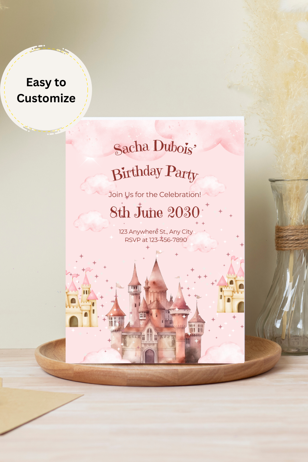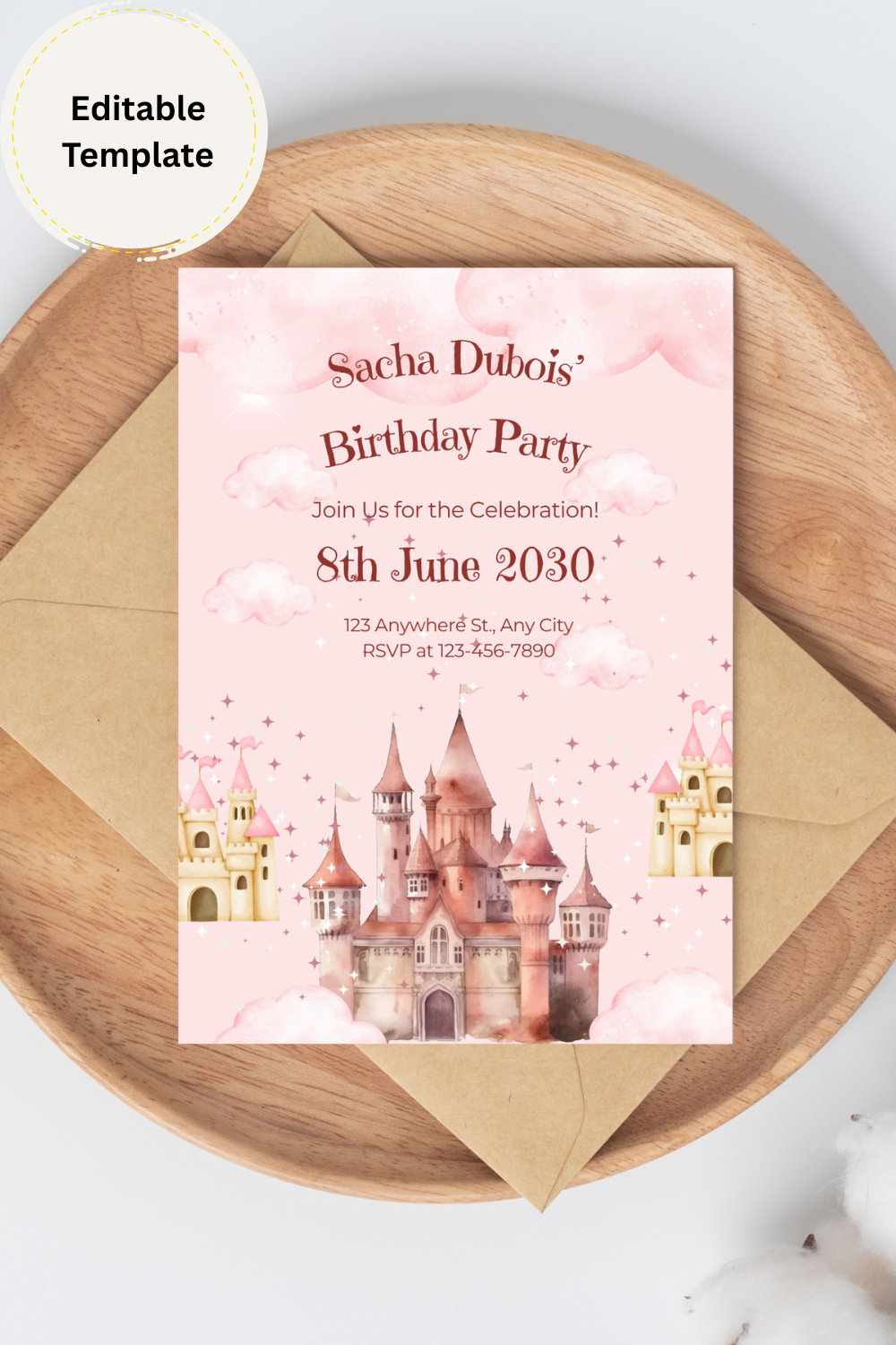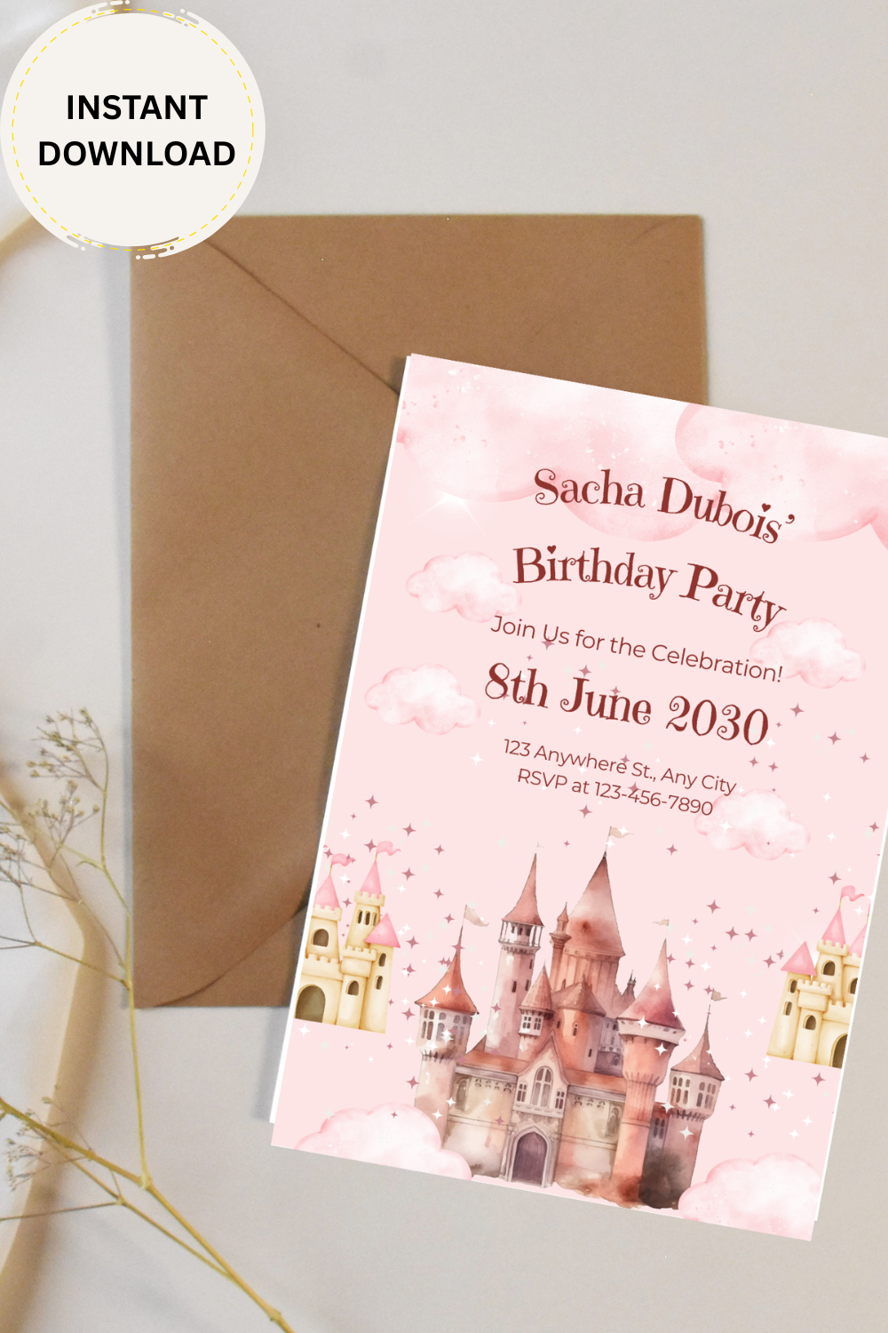 Make your child’s party unforgettable with this magical pink princess castle birthday invitation template – editable, affordable, and ready in minutes!