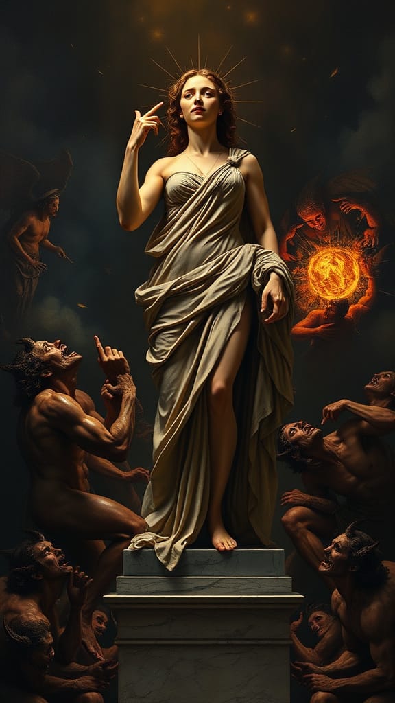 a strong woman in classical robes standing calmly amidst chaos. She is rendered with rich shadows and vibrant primary colors in an abstract style, with influences from bold color fields