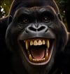 Très proche de la caméra, le regard calme, la bouche légèrement ouverte laissant apparaître les dents, ce gorille n’est ni menaçant ni caricatural.