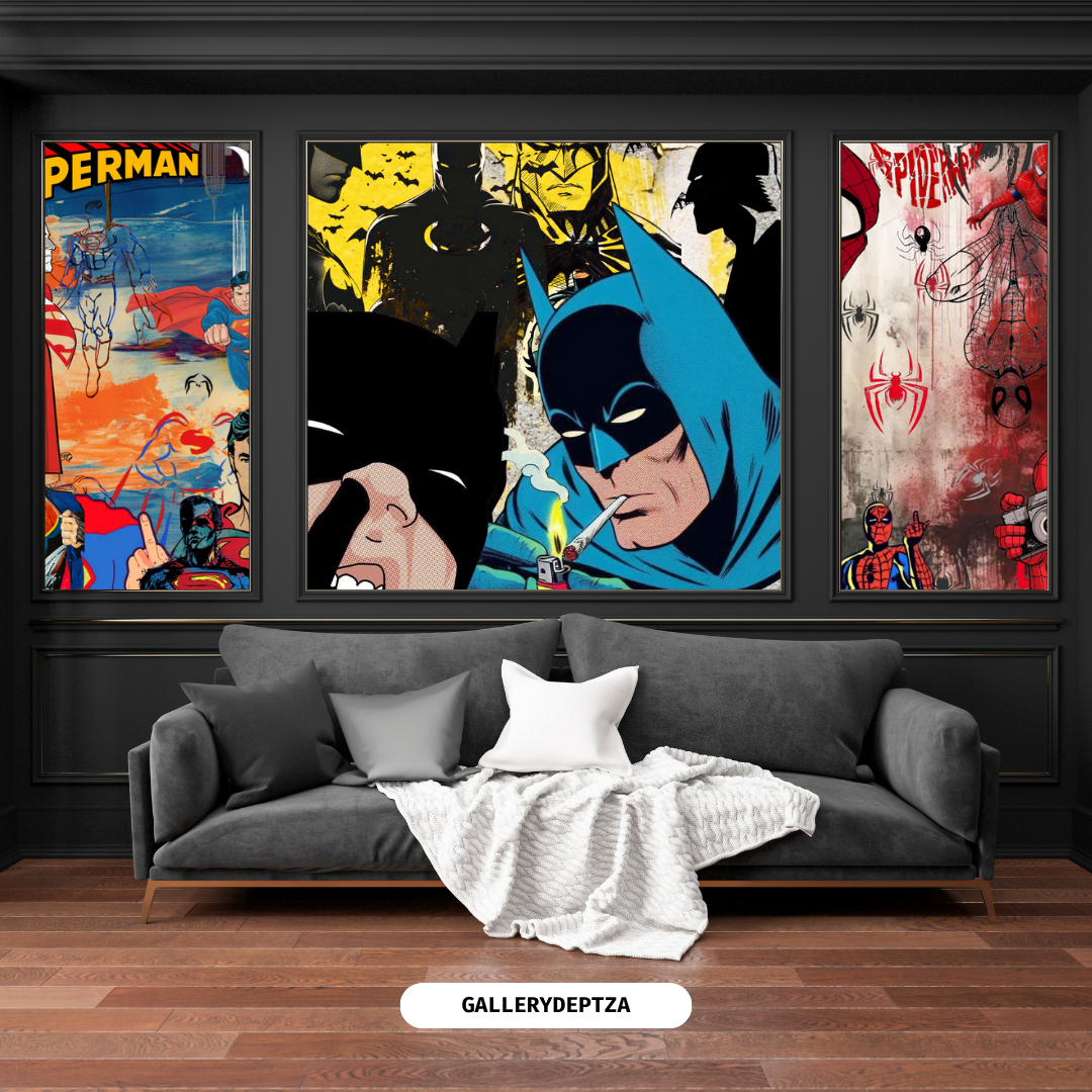 Unite three of the greatest heroes in one powerful collection. This Superhero Legends Animated Art Bundle features Spiderman, Batman, and Superman in bold, high-quality animated designs — perfect for transforming your space with heroic energy and striking color.