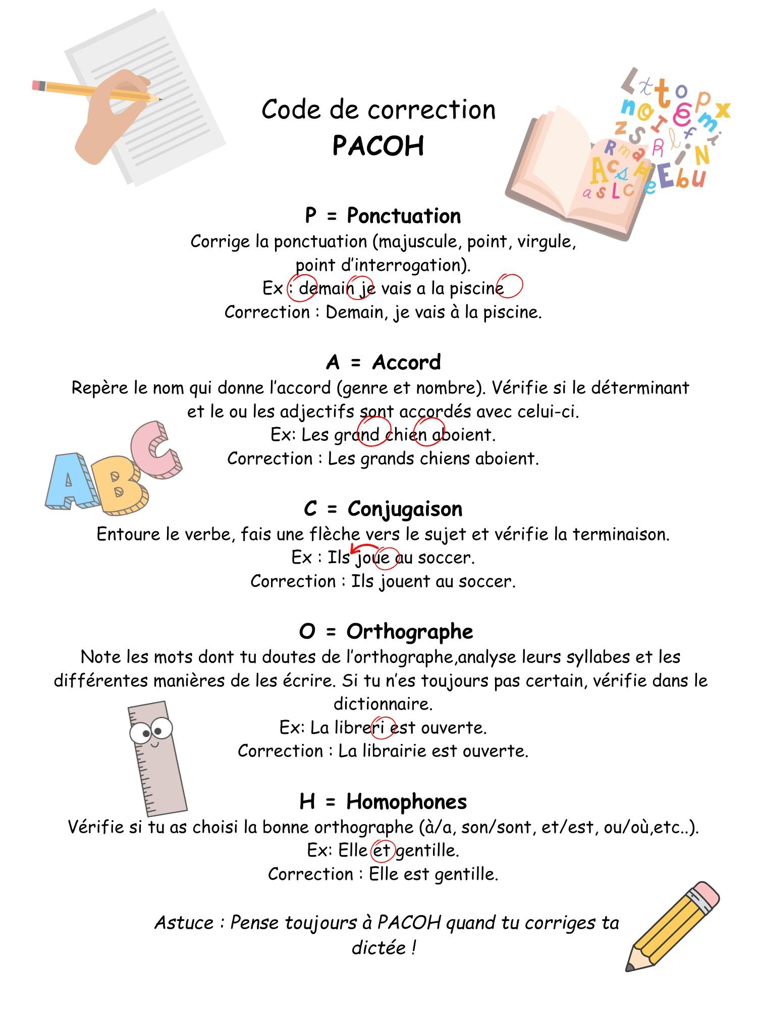 Ce code de correction est principalement conçu pour corriger des dictées ou un texte préconçu.