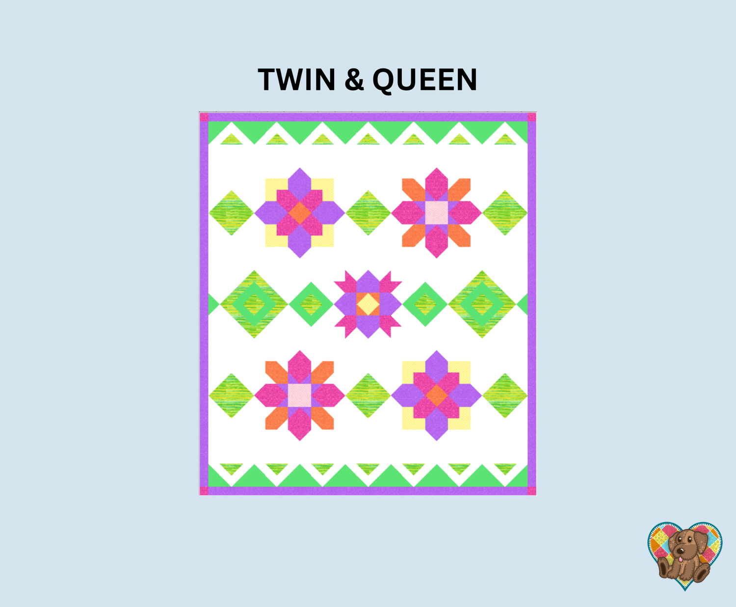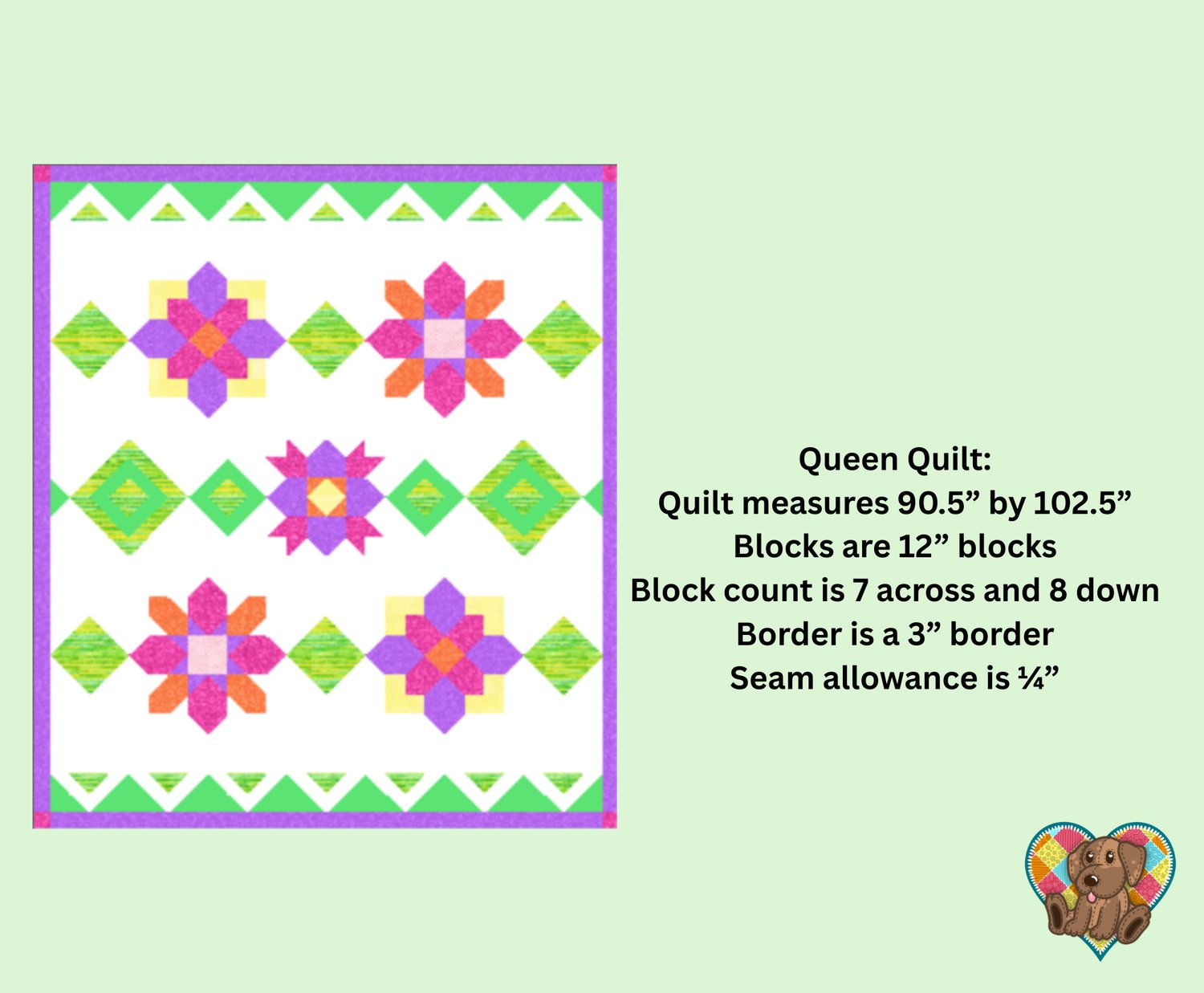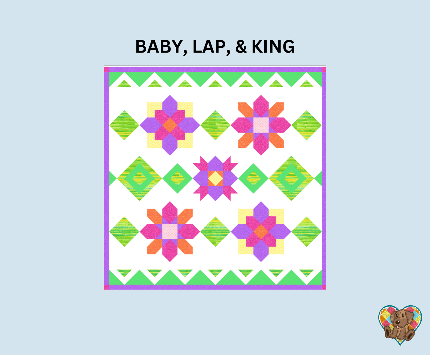 *Note: This pattern includes instructions for a baby (44.5" X 44.5"), lap (64" X 64"), twin (79.75" X 90.5"), queen (90.5" X 102.5"), and king (110" X 110") size quilt.* Blocks are traditional pieced blocks.