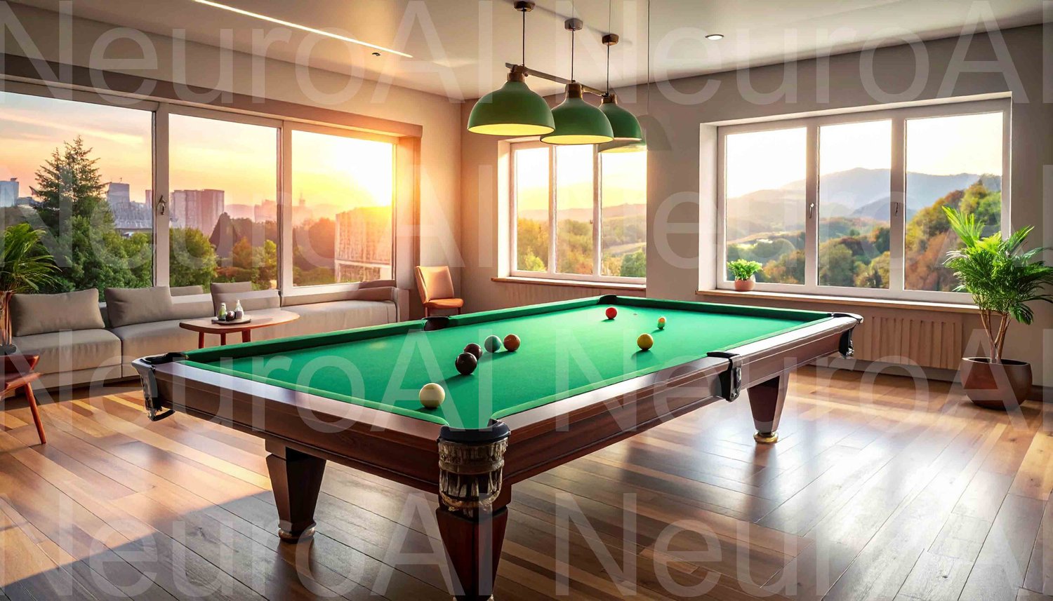 Elegant billiard room at sunset with city views