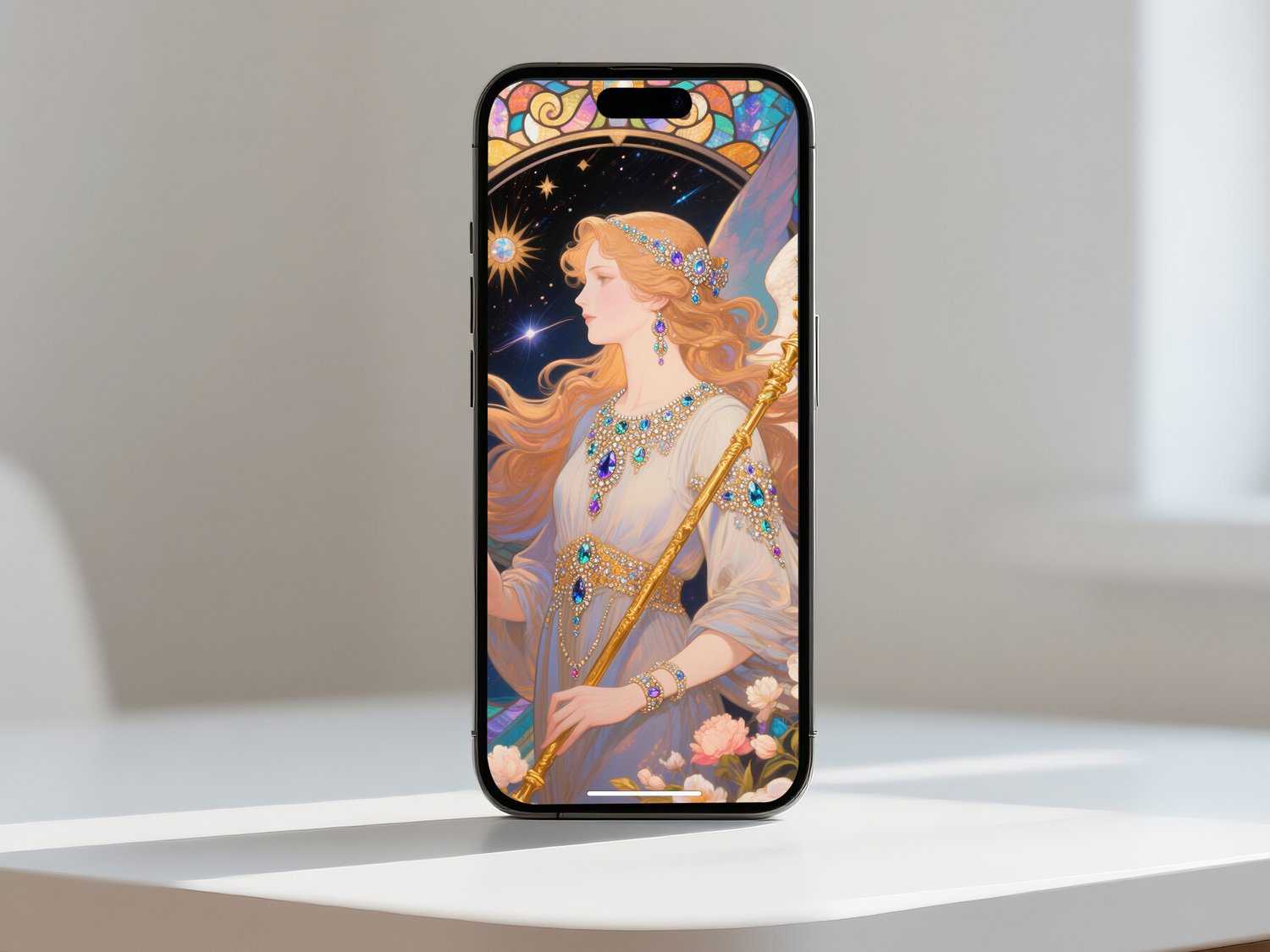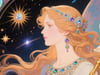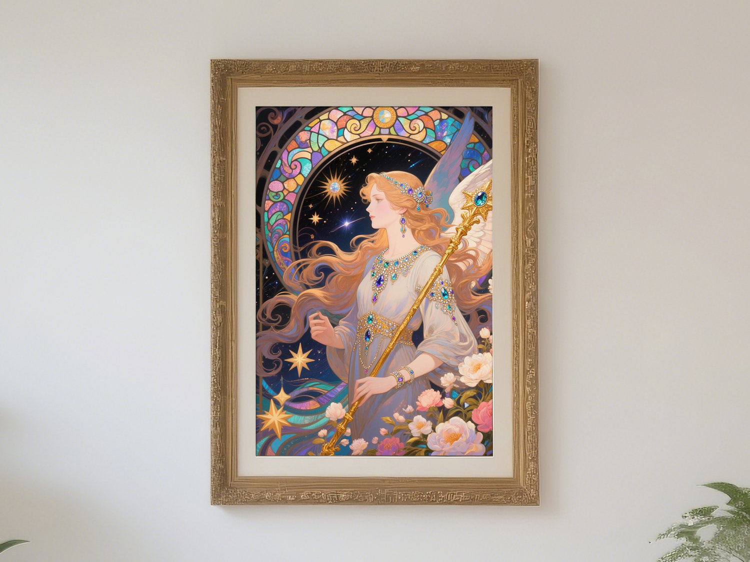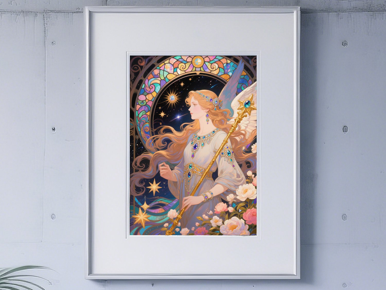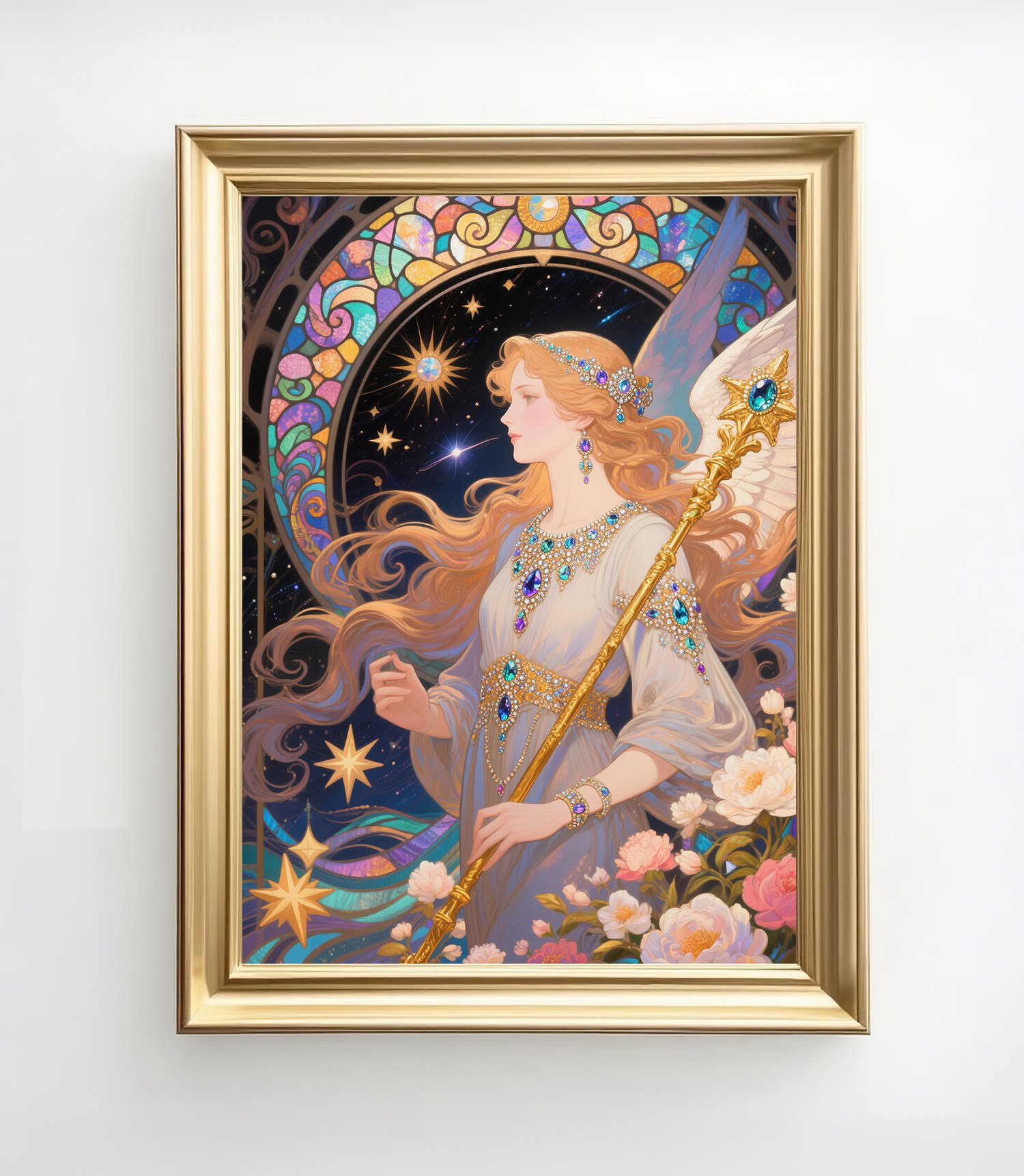A beautiful angel with flowing hair, sparkling jewels, and a noble golden staff appears in a magical scene surrounded by blooming flowers, shimmering stars, cosmic waves, swirling patterns, and luxurious celestial motifs.