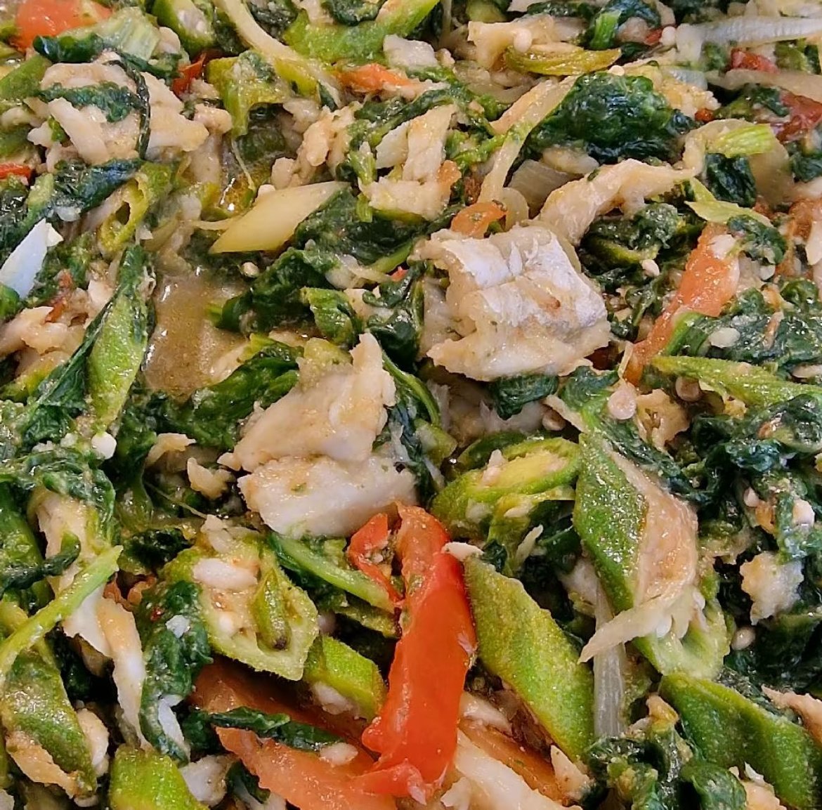 The dish is typically prepared with onions, garlic, tomatoes, Scotch bonnet peppers, and herbs, then gently sautéed in oil until everything is fragrant and well combined. The result is a savory, nutritious, and flavorful plate that balances the earthiness of callaloo with the salty richness of codfish.