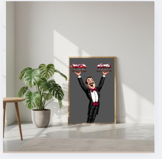 Introducing our "Waiter Serving Drinks" digital wall art—a vibrant piece that transforms your space into a gallery. This artwork captures the elegance of hospitality, where a poised waiter carries an array of colorful beverages, each drink inviting you into a world of sophistication and charm. The intricate details and dynamic color palette make it not just a visual treat but an immersive experience, reminiscent of bustling cafes and lively social gatherings. Set against a backdrop of artistic finesse, this digital wall art is the perfect accent for any modern or classic interior design.Integrating seamlessly with your décor, it adds an element of storytelling to your home or office, sparking conversations and inspiring creativity. This piece is more than an image; it’s a narrative of elegance and service, vividly brought to life in each pixel. Elevate your walls with art that resonates with both character and style, redefining your space with a touch of cultural allure.